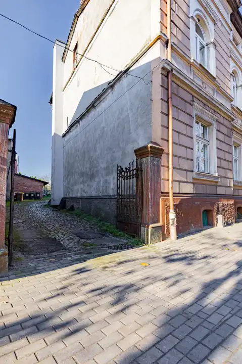 Doskonała lokalizacja – kamienica zlokalizowana w samym centrum miasta przy jednej z głównych ulic. W pobliżu znajduje się parking miejski oraz skwer zieleni w cieniu drzew.