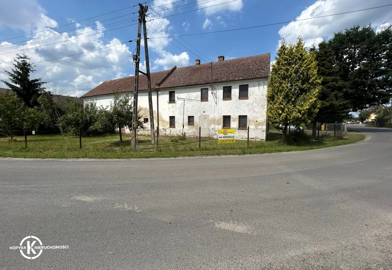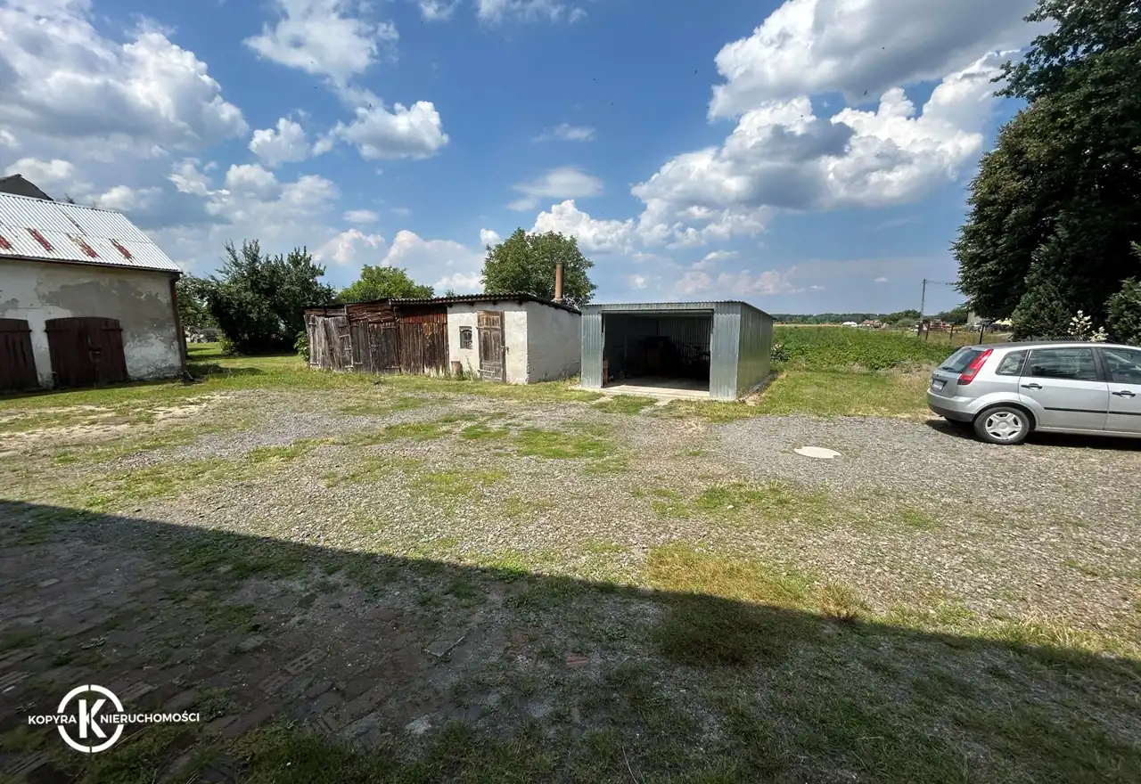Budynek mieszkalny dwukondygnacyjny o powierzchni użytkowej mieszkalnej ok. 140 m2, usytuowany na działce liczącej 1950 m2. Teren wokół domu ogrodzony i zagospodarowany: nasadzenia zieleni oraz drzew, trawa, dodatkowy garaż- blaszak. Na działce znajdują się również zabudowania gospodarcze o pow. zabudowy około 170 m2.
