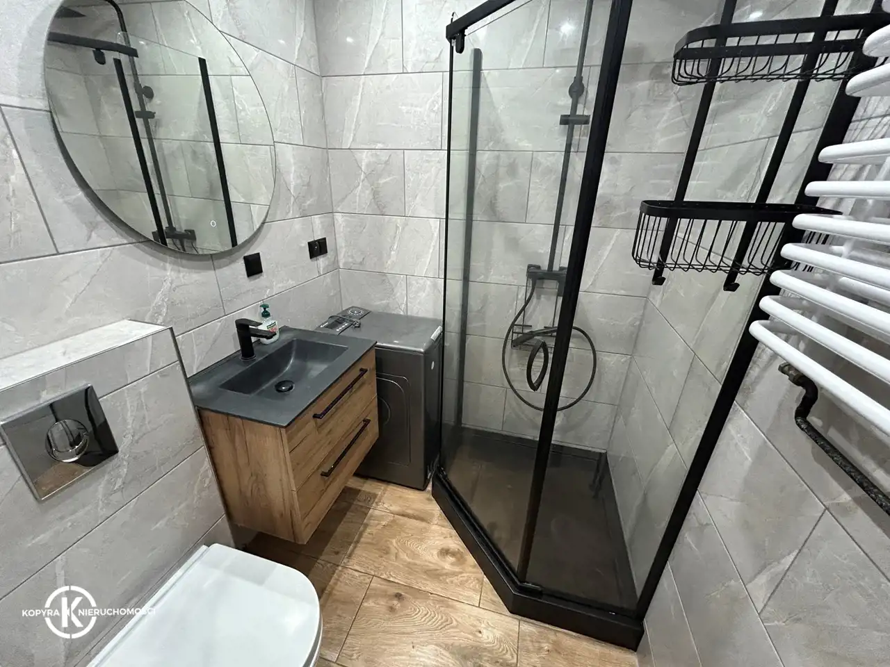 - w łazience kabina prysznicowa, toaleta, umywalka z szafką, lustro oraz pralka