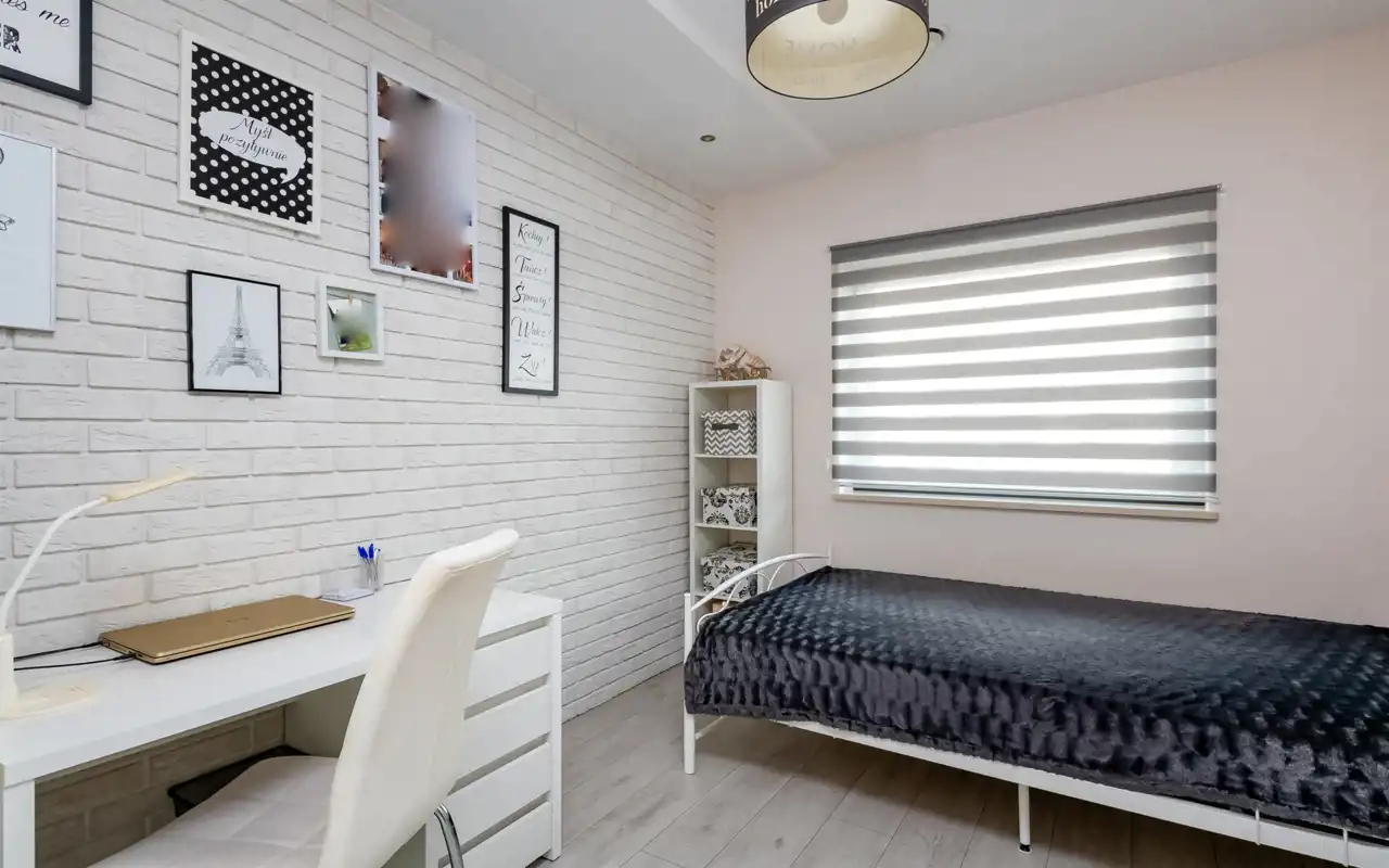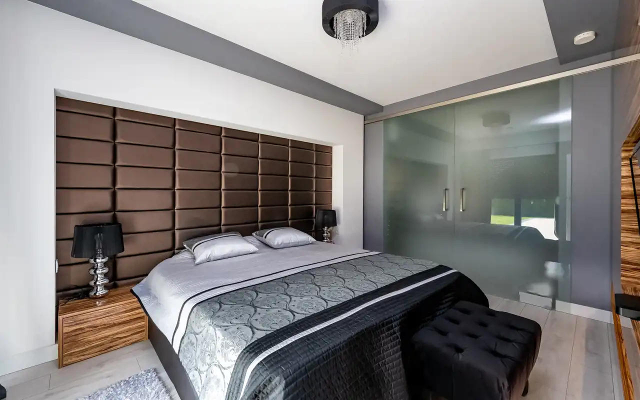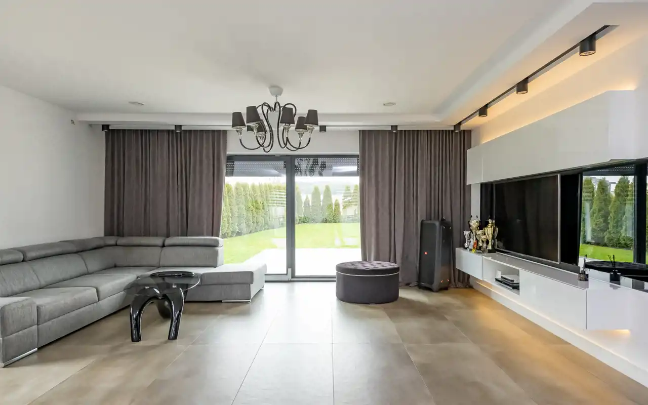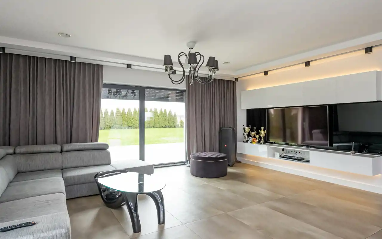 Dom z wieloma udogodnieniami. Bogate i nowocześnie wykończone wnętrze. Kuchnia wykonana na zamówienie od stolarza, blaty kuchenne wykonane ze spieków kwarcowych. Pełne AGD wliczone w cenę nieruchomości (Boch i Samsung). Przestronny salon z zabudową RTV. W części centralnej domu klimatyzacja Hisense. Przemyślany rozkład pomieszczeń wraz z pomocniczymi częściami takimi jak garderoba w głównej sypialni czy pralnia z suszarnią.