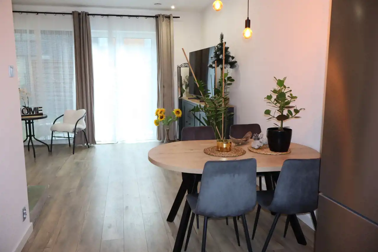 ATRAKCYJNY DOM W ZABUDOWIE SZEREGOWEJ z dwoma miejscami postojowymi na samochody, położony na działce o powierzchni 124 m2.