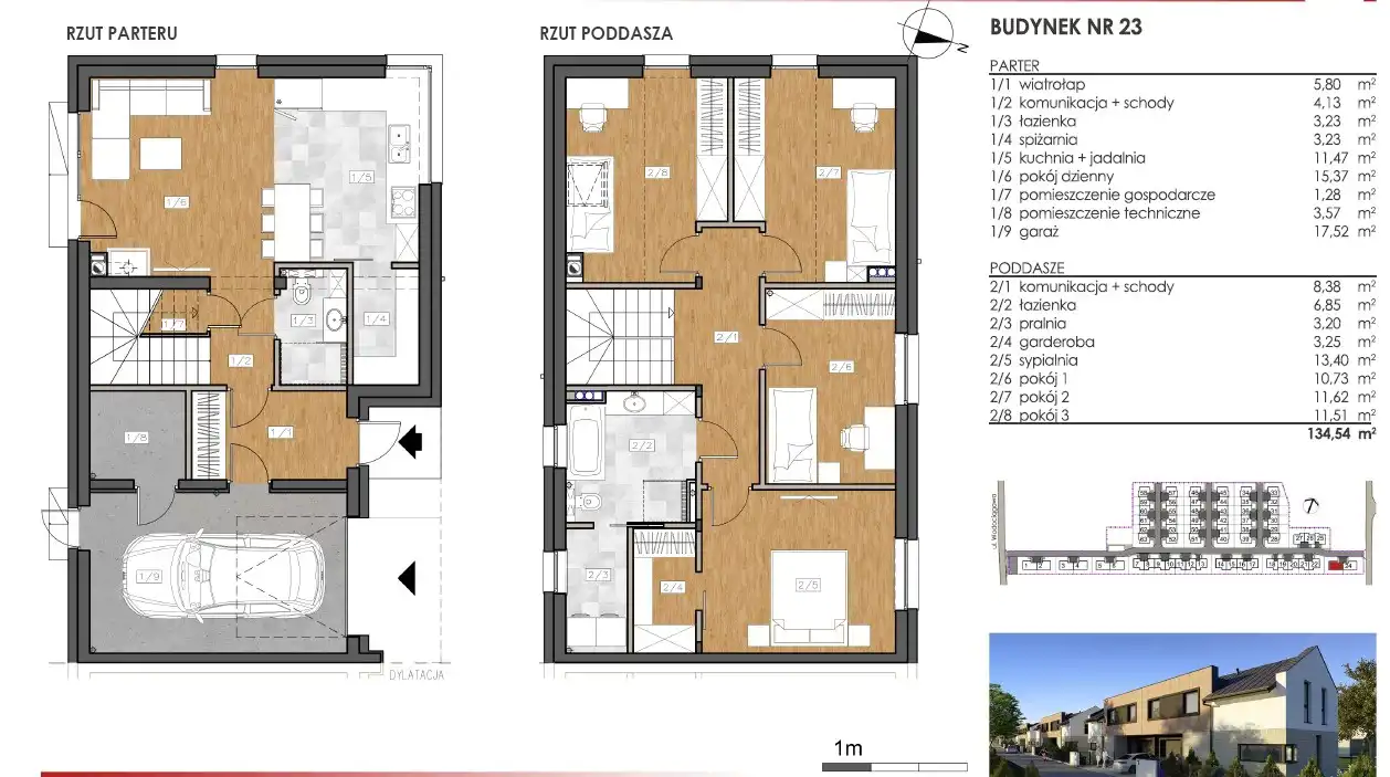 Powierzchnie domów od 121,27 m2 do 134,54 m2.