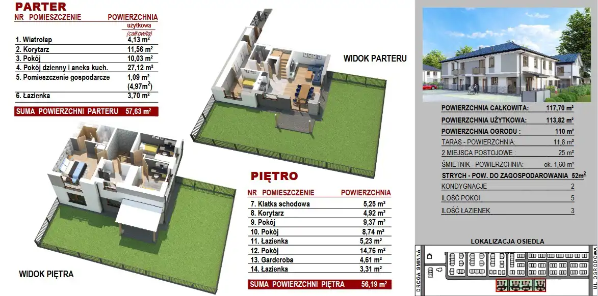 - Ogród: 110 m² z zadaszoną grillownią