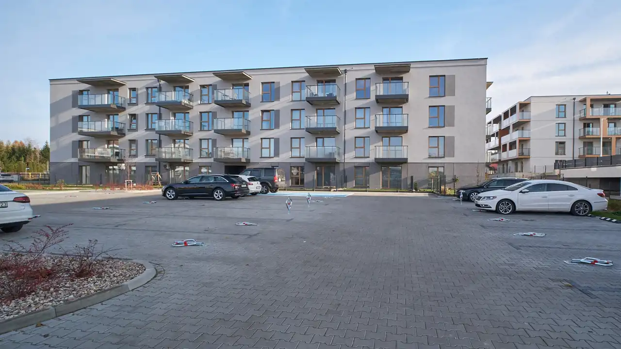 Nowoczesne osiedle mieszkaniowe. Niskie bloki. Przed blokiem parkingi dla samochodów.