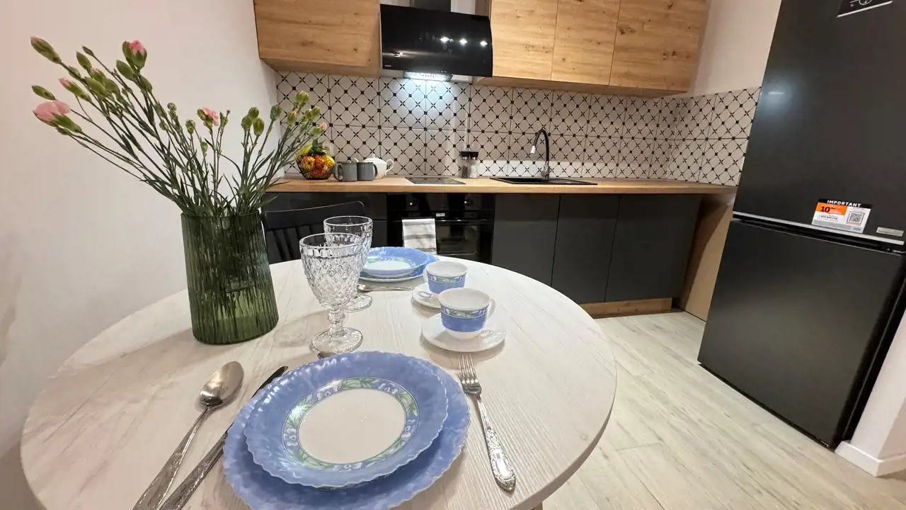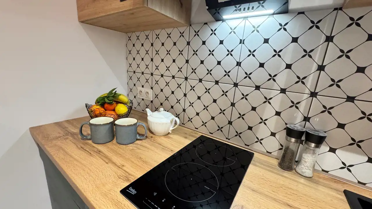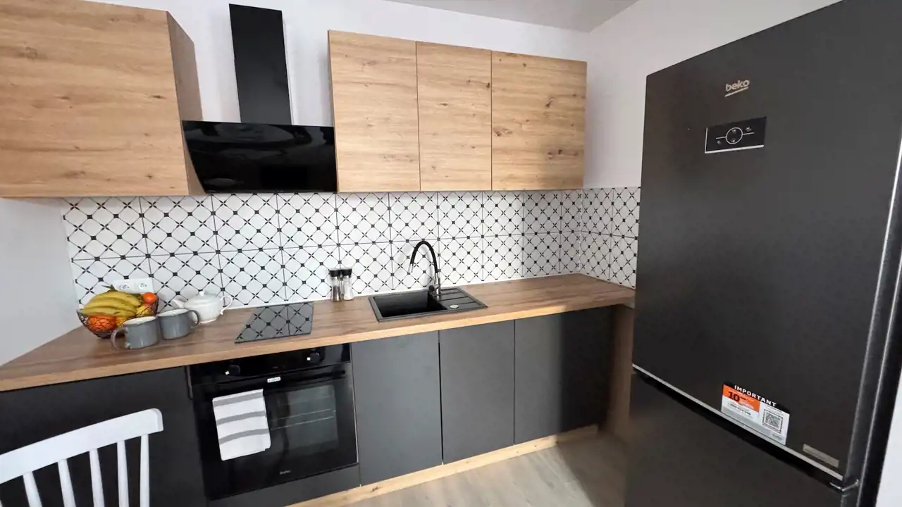 Kuchnia z nowoczesnymi urządzeniami, ergonomicznie zaprojektowana przestrzeń dzienna oraz sypialnia sprzyjająca wyciszeniu po dniu pracy.