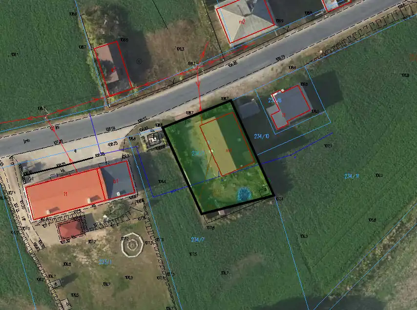 Na działce nr. Ewid. 234/1 o pow. 600m2 znajduje się budynek mieszkalny z częścią garażową i tarasem zadaszonym na wysokości 1 piętra.