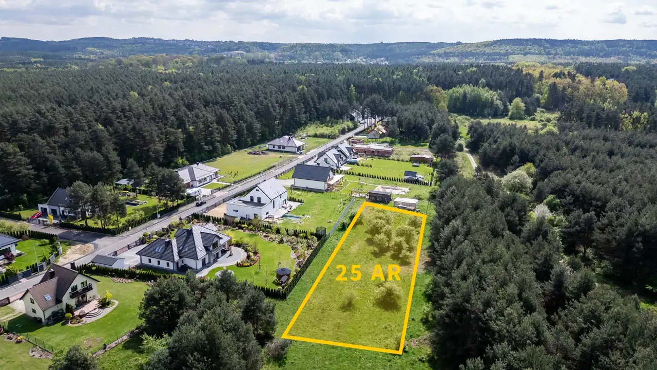 Powierzchnia 25 arów. Znajduje się w zacisznym miejscu w otoczeniu nowej zabudowy domów jednorodzinnych wśród drzew iglastych.