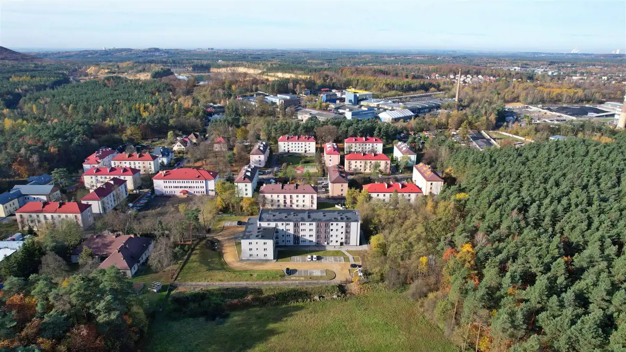 Mieszkanie zlokalizowane na wysokim parterze w 3 piętrowym budynku, zlokalizowanym w enklawie, w bezpośrednim sąsiedztwie lasu. Budynek posiada 44 mieszkania. Do każdego z mieszkań przynależy zewnętrzne miejsce postojowe oraz komórka lokatorska na poziomie piwnicy. Działka, na którym posadowiony jest budynek, ma powierzchnie 0,60 ha i jest ogrodzona. Budynek wybudowany w technologii tradycyjnej, gruntownie zmodernizowany. Ściany zewnętrzne z pustaków, ocieplone styropianem, okna pcv, ogrzewanie z sieci miejskiej, system ciepłej wody do indywidualnego montażu (bojler elektryczny lub przepływowy podgrzewacz wody), brak gazu. Modernizacja zakończona w 2022 r.