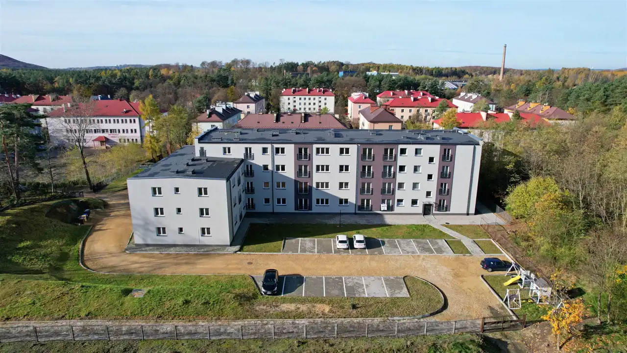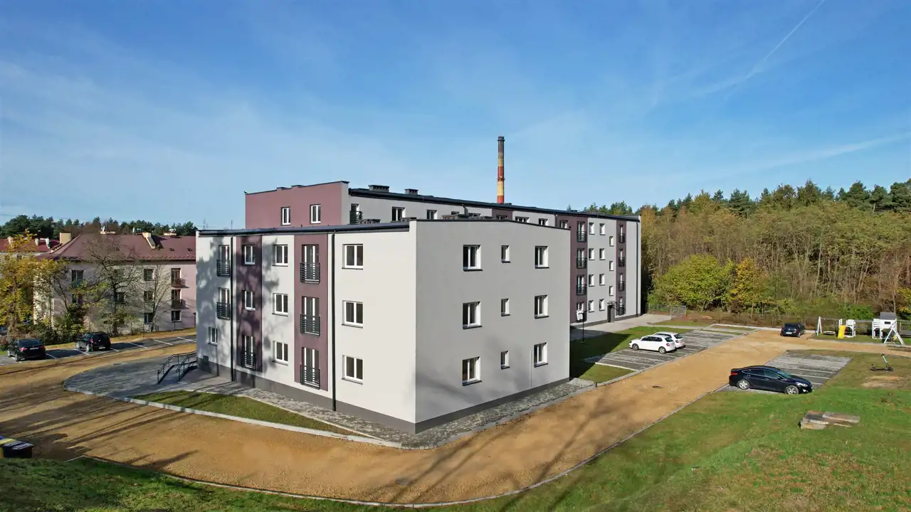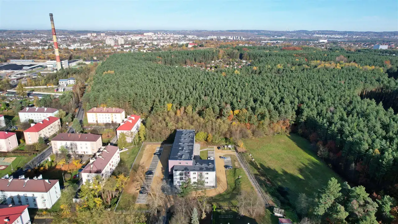 Mieszkanie zlokalizowane na parterze w 3 piętrowym budynku, zlokalizowanym w enklawie, w bezpośrednim sąsiedztwie lasu. Budynek posiada 44 mieszkania. Do każdego z mieszkań przynależy zewnętrzne miejsce postojowe oraz komórka lokatorska na poziomie piwnicy. Działka na którym posadowiony jest budynek ma pow. 0,60 ha i jest ogrodzona. Budynek wybudowany w technologii tradycyjnej, gruntownie zmodernizowany. Ściany zewnętrzne z pustaków, ocieplone styropianem, okna pcv, ogrzewanie z sieci miejskiej, system ciepłej wody do indywidulanego montażu (bojler elektryczny lub przepływowy podgrzewacz wody), brak gazu. Modernizacja zakończona w 2022 r.