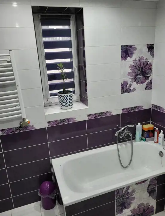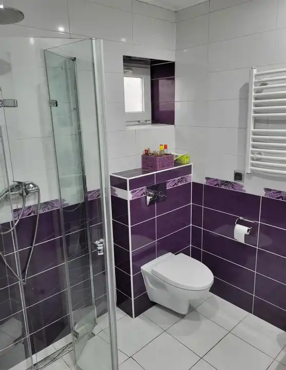 W łazience znajdziemy kabinę prysznicową z odpływem liniowym a także wannę.