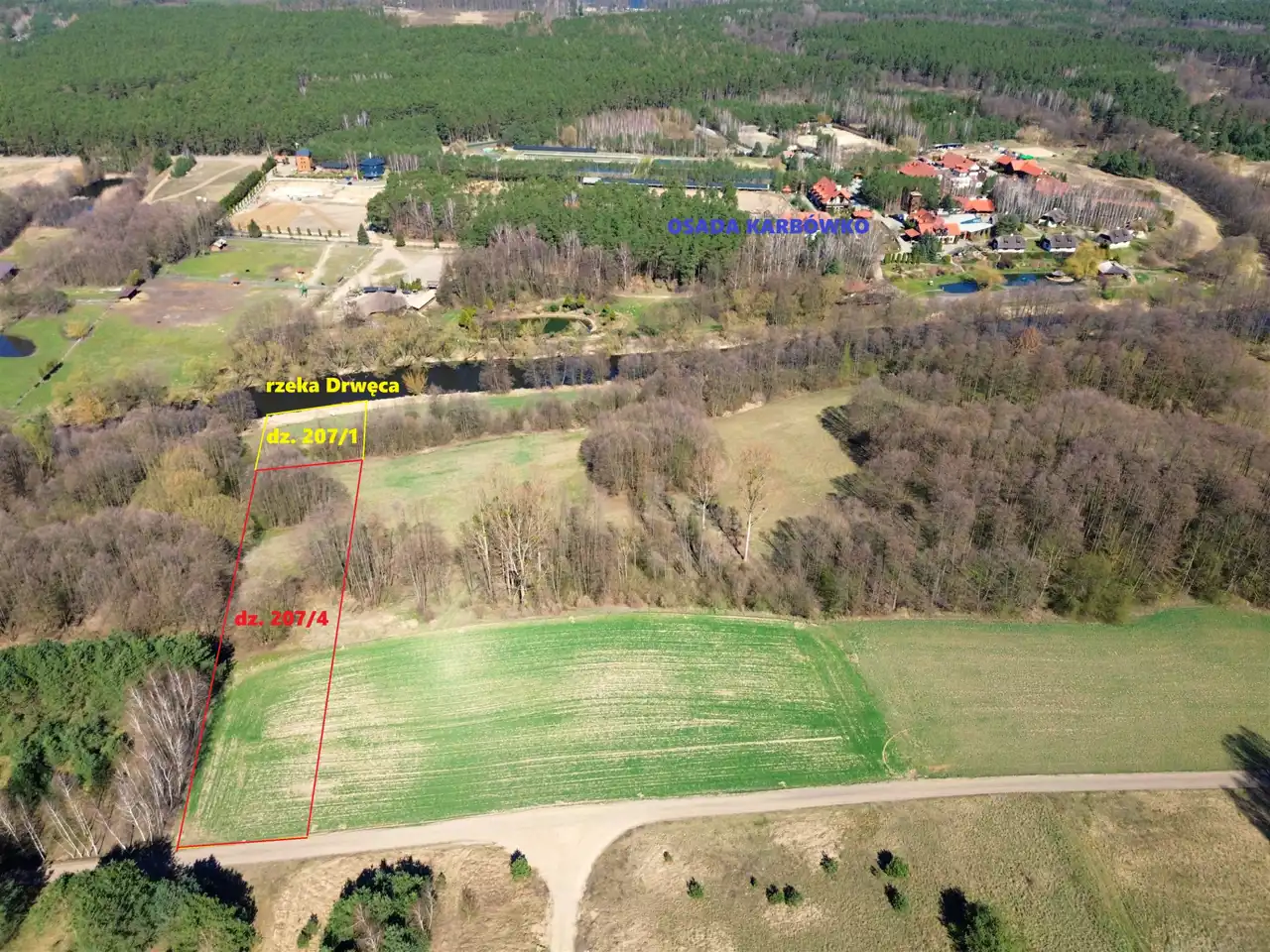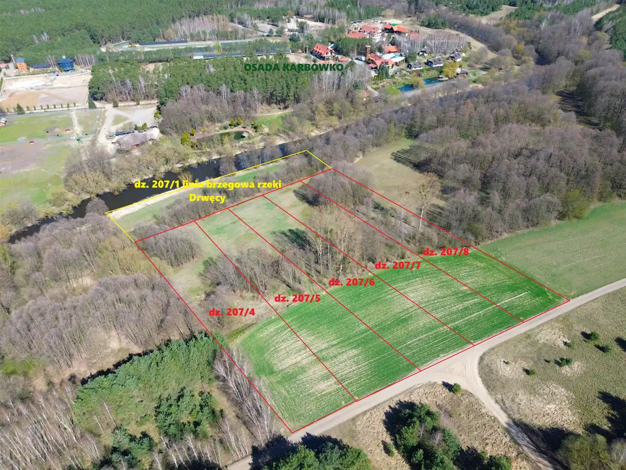 Dostęp do rzeki odbywa się poprzez sprzedaż udziału w działce 207/1 obliczonej jako powierzchnię w przedłużeniu granicy zakupionej działki do rzeki lub wydzielenie działki na powiększenie nieruchomości sąsiedniej.