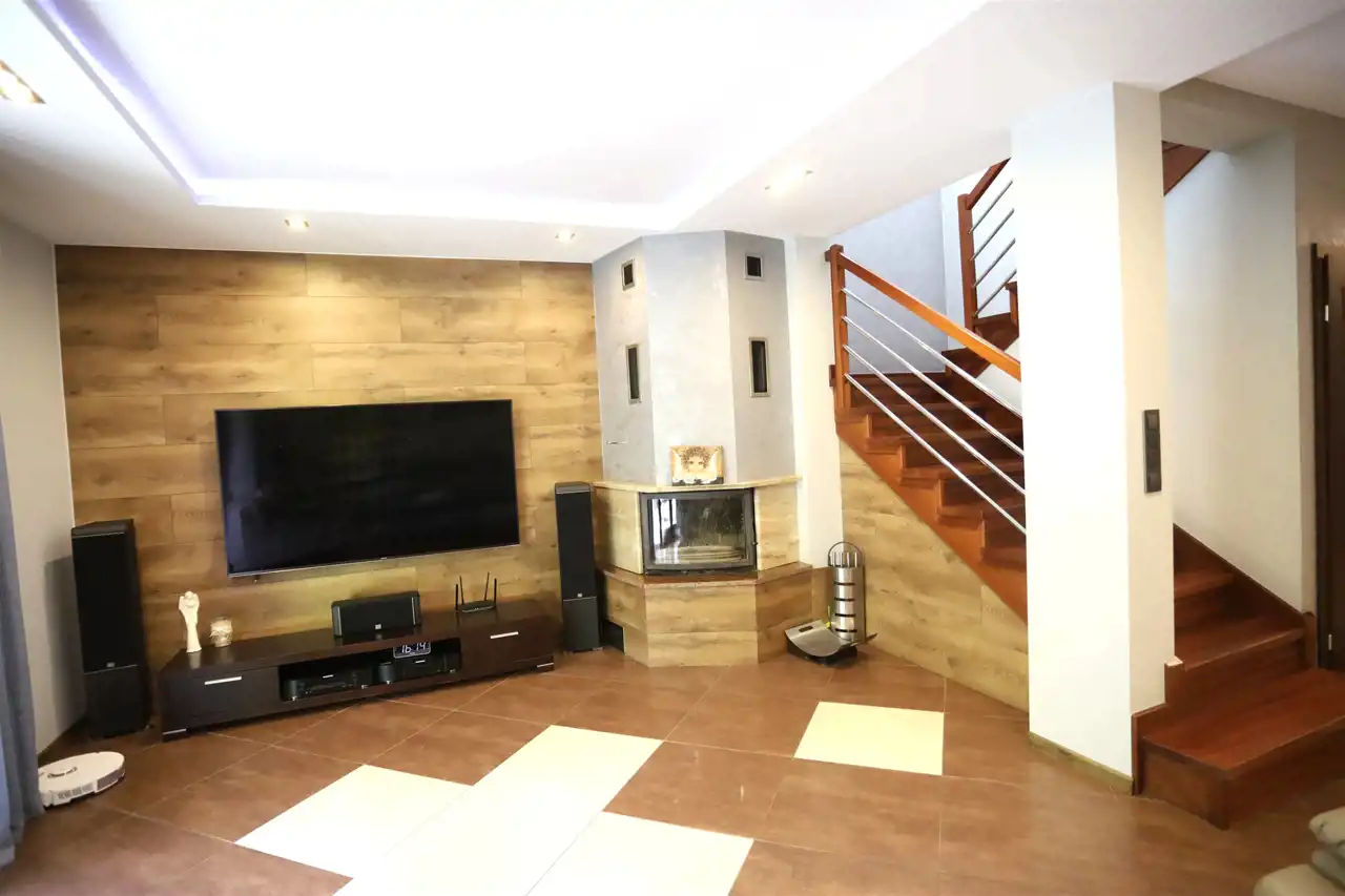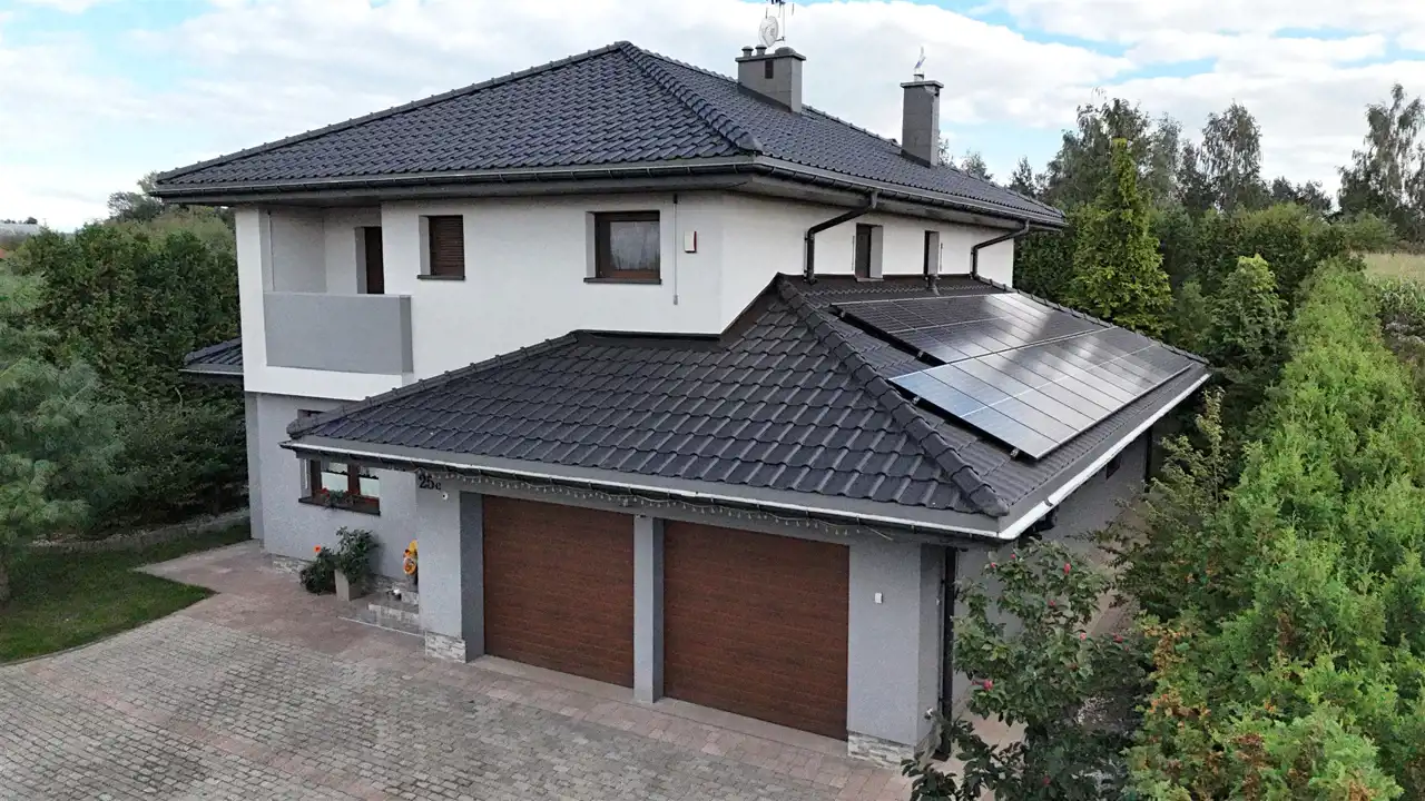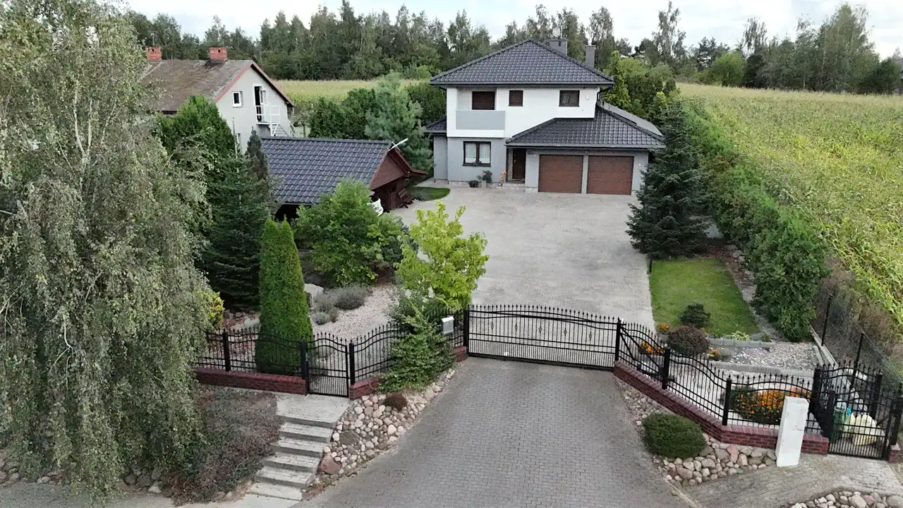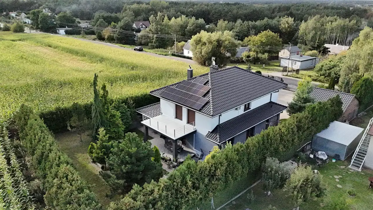 Dom 10 letni, wybudowany przez właścicieli bardzo solidnie: ściany z suporeksu, ocieplone twardą wełną 18cm i położony tynk strukturalny. Na dachu dachówka ceramiczna antracyt, płyta OSB i ocieplony wełną mineralną, dodatkowo jeszcze na stropie położona wełna mineralna. Na dachu zainstalowano panele fotowoltaiczne -10kWh ( umowa wg. starych zasad) i ogrzewanie jest w domu elektryczne (niskie koszty ogrzewania). Woda i kanalizacja z sieci gminnej. W domu zainstalowana jest: stacja uzdatniania wody, monitoring i alarm, rolety antywłamaniowe elektryczne w całym domu, klimatyzacja w salonie. Wszystkie pomieszczenia na parterze domu maja ogrzewanie podłogowe. W salonie jest kominek. Okna PCV dwuszybowe.