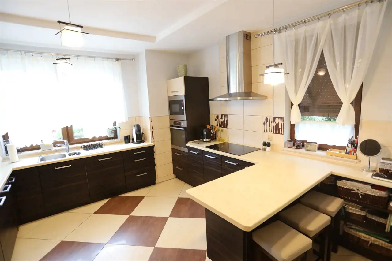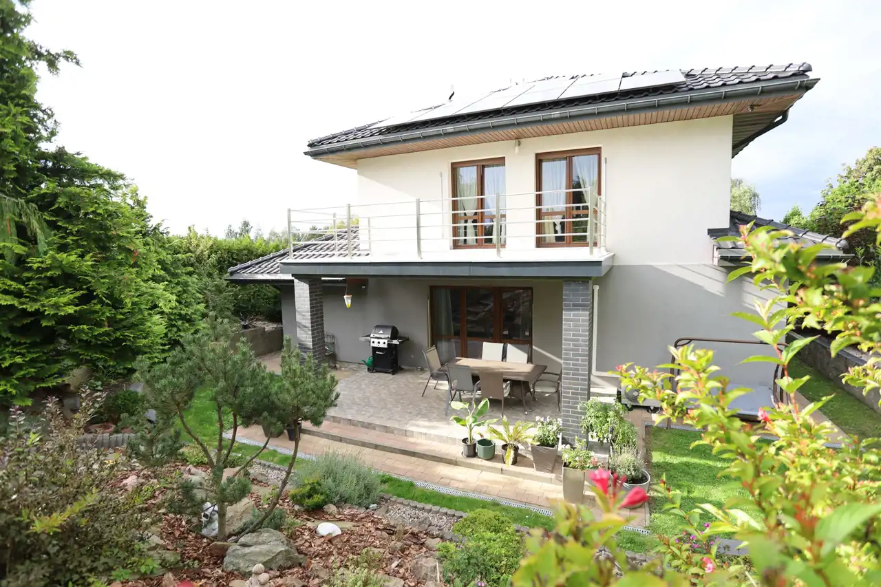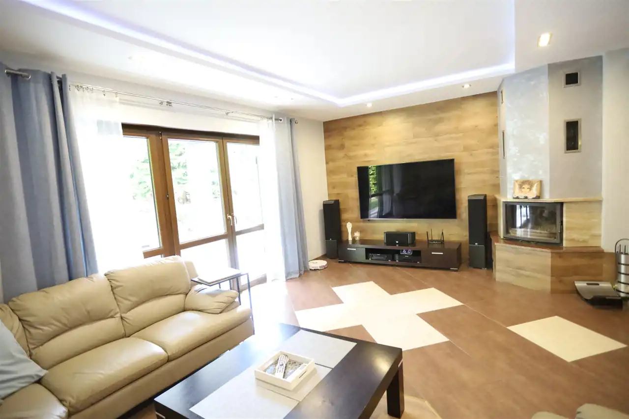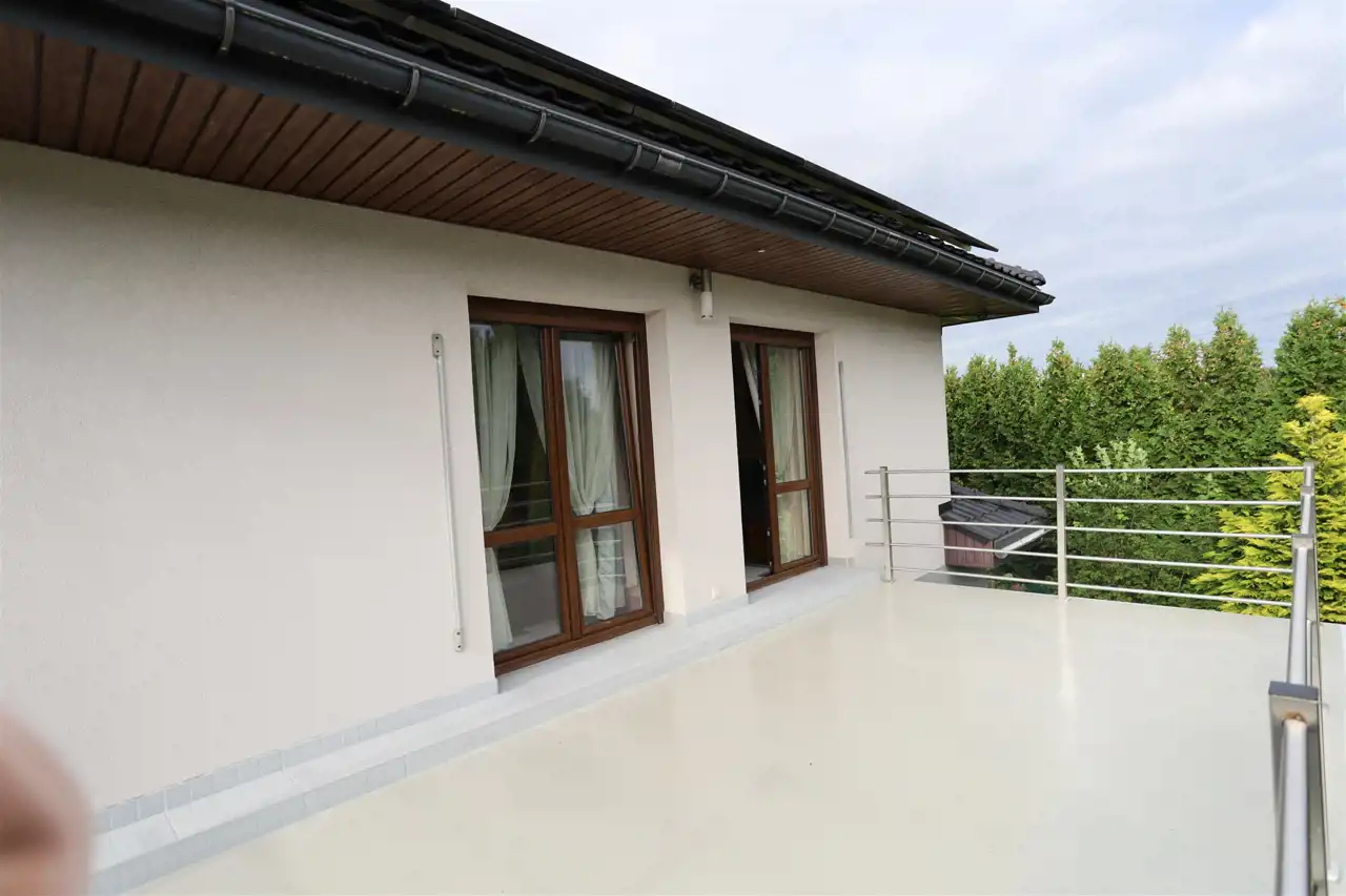 Dom 10 letni, wybudowany przez właścicieli bardzo solidnie: ściany z suporeksu, ocieplone twardą wełną 18cm i położony tynk strukturalny. Na dachu dachówka ceramiczna antracyt, płyta OSB i ocieplony wełną mineralną, dodatkowo jeszcze na stropie położona wełna mineralna. Na dachu zainstalowano panele fotowoltaiczne -10kWh ( umowa wg. starych zasad) i ogrzewanie jest w domu elektryczne (niskie koszty ogrzewania). Woda i kanalizacja z sieci gminnej. W domu zainstalowana jest: stacja uzdatniania wody, monitoring i alarm, rolety antywłamaniowe elektryczne w całym domu, klimatyzacja w salonie. Wszystkie pomieszczenia na parterze domu maja ogrzewanie podłogowe. W salonie jest kominek. Okna PCV dwuszybowe.