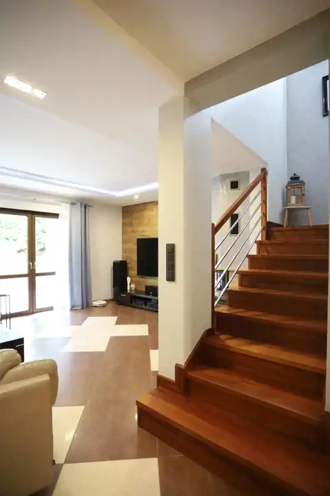 Kontakt i prezentacja: Violetta Krajewska, tel.693146064Parter domu składa się z: salonu otwartego na jadalnię (43 m2) z wyjściem na duży 20m2 taras oraz pokoju (8,5 m2), kuchni (15m2), łazienki (4m2), holu (13m2) i wiatrołapu. Na podłogach płytki pod ogrzewanie podłogowe. Kuchnia jest z nowoczesną zabudową oraz wyposażeniem w sprzęt AGD .