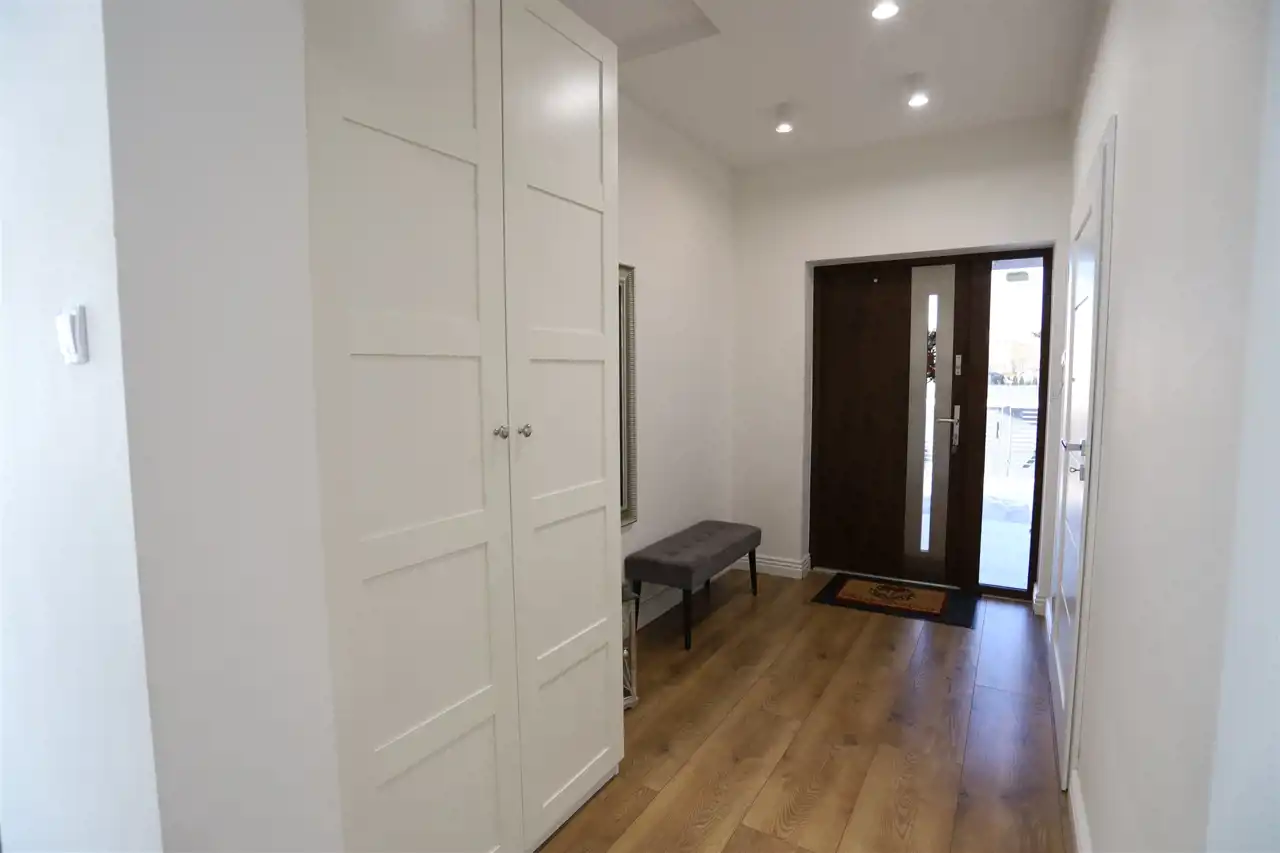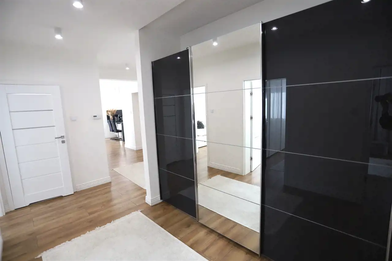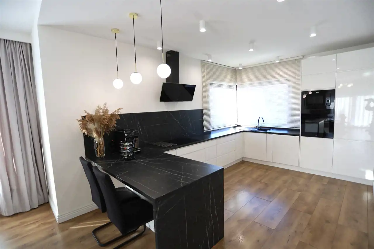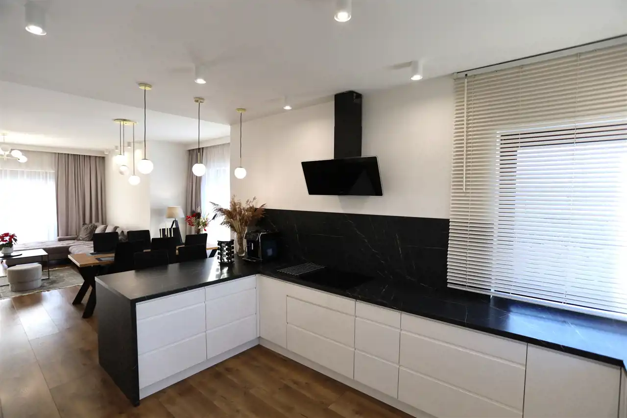 Dom został nowocześnie wykończony i wyposażony. Na podłogach panele. Kuchnia z nowoczesną zabudową z meblami lakierowanymi oraz sprzętem AGD w zabudowie ( płyta indukcyjna, piekarnik, mikrofala, zmywarka, lodówka i duży nowoczesny okap kuchenny). Wszystkie pokoje umeblowane.
