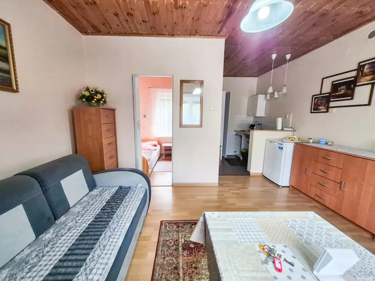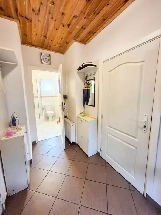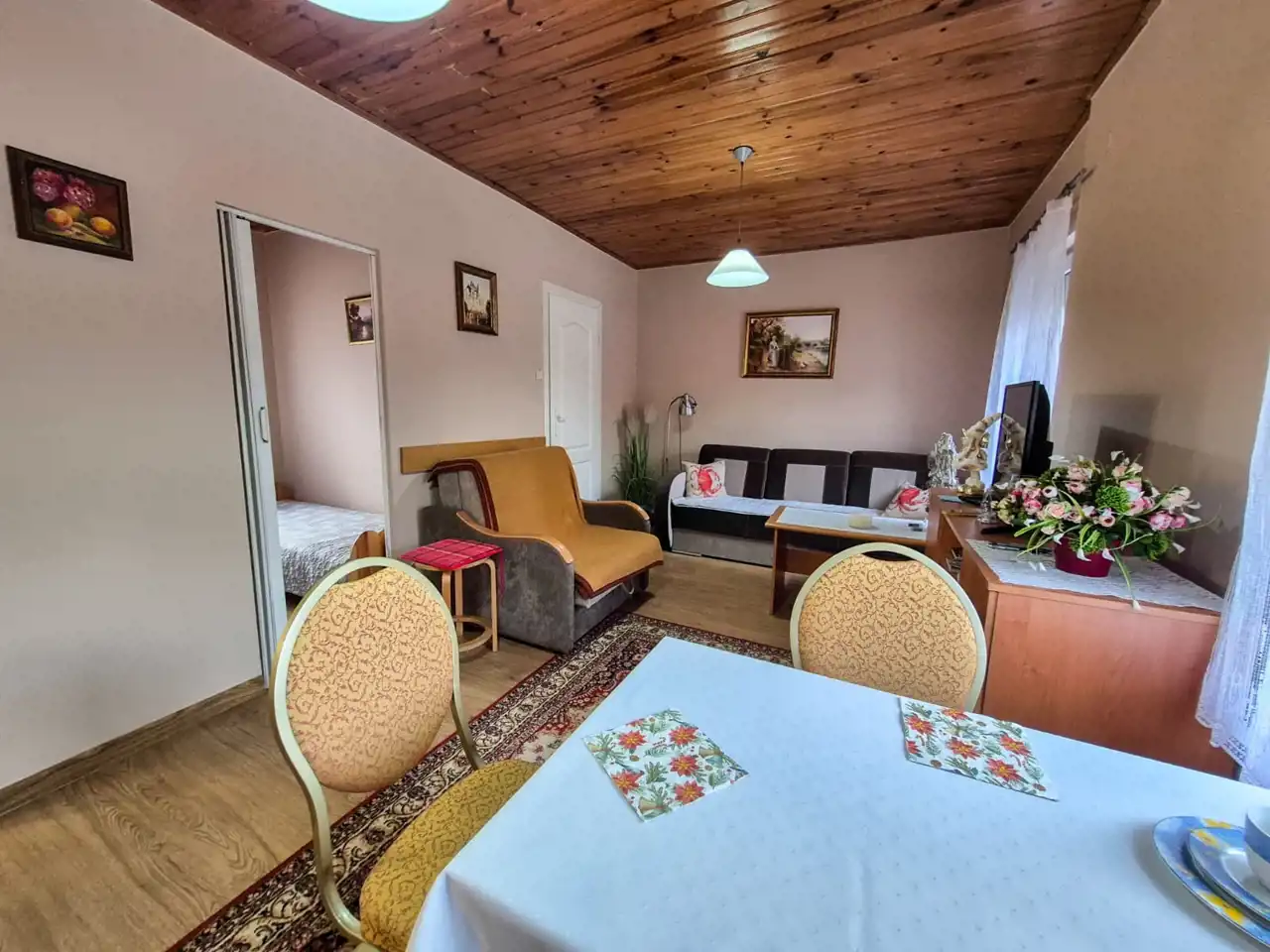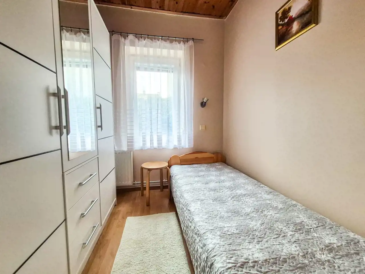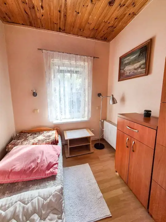 Na podłogach w pokojach położone są panele, praktyczne i łatwe w utrzymaniu czystości, a w pozostałych pomieszczeniach płytki. Sufity wykończone zostały deskami, co podkreśla naturalny styl nieruchomości i wprowadza wyjątkowy klimat do pomieszczeń. Dodatkowym atutem są zamontowane żaluzje zewnętrzne.
