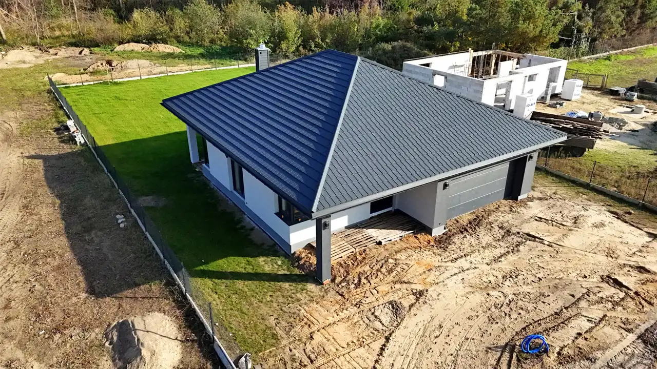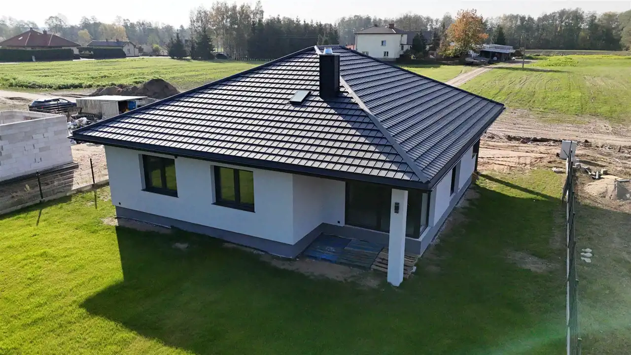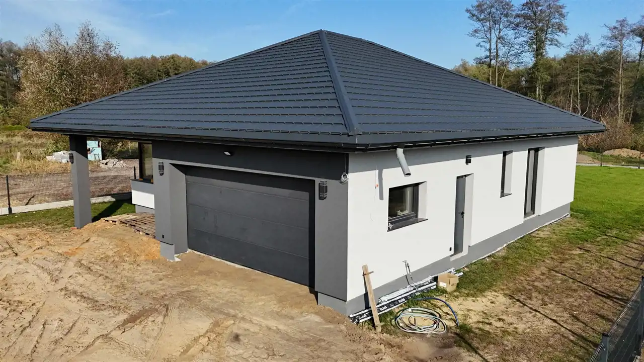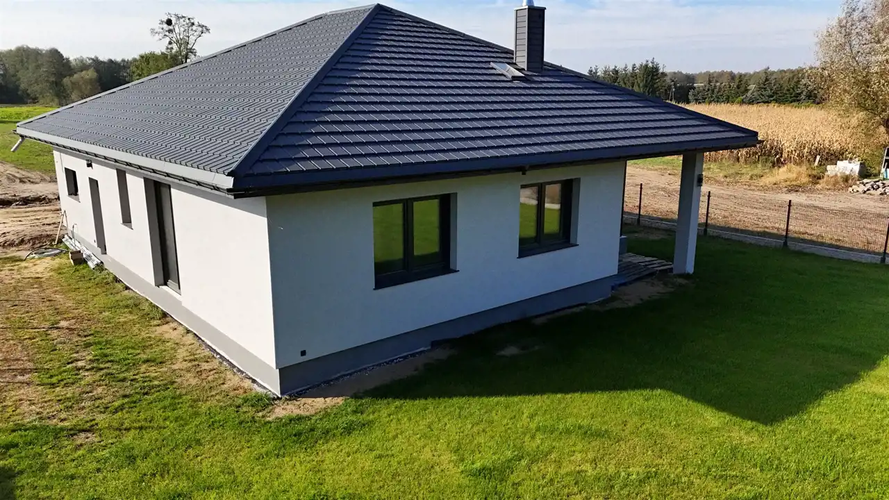 Budynek pobudowany wg projektu "Blanka Beta" z suporeksu i docieplony 20-centymetowym styropianem. Elewacja wykończona tynkiem strukturalnym. Dach i strop konstrukcji drewnianej z prefabrykatów (wiązary dachowe) docieplony wełną celulozową grubości 40 cm. Dach kryty blachodachówką z całą obróbką blacharską i orynnowaniem.