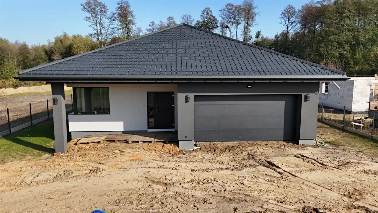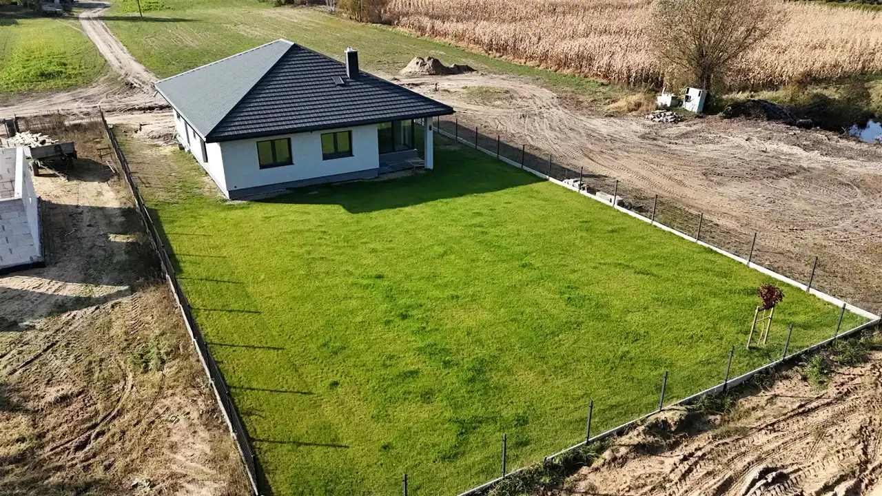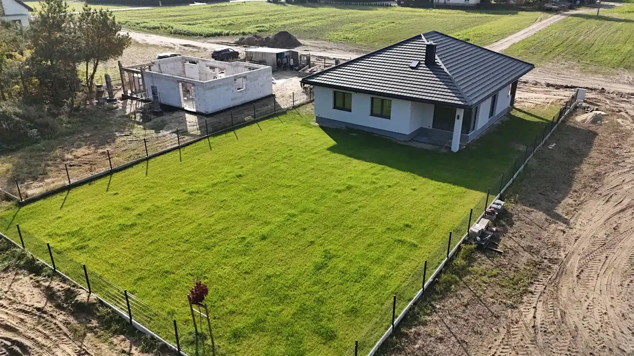 Działka obecnie ogrodzona z trzech stron ogrodzeniem panelowym z podmurówką. Niebawem zostanie wykonana kostka brukowa (podjazd, taras, opaska wokół domu) oraz ogrodzenie frontowe.