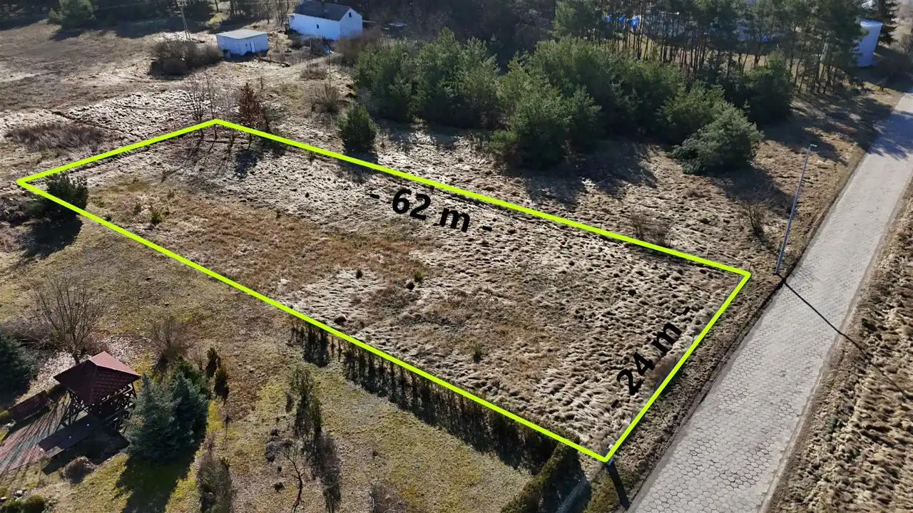 Działka o powierzchni 1504 m2 o wymiarach 24 x 62 m. Działka posiada przyłącze elektroenergetyczne, woda w pasie drogowym obok działki.