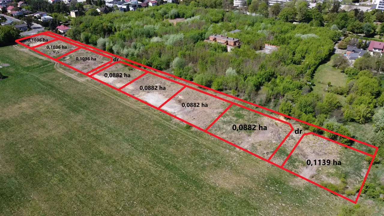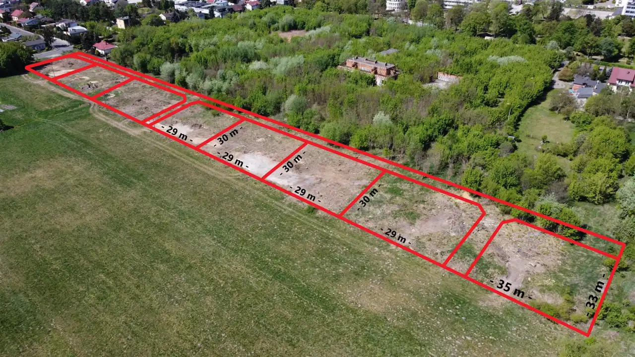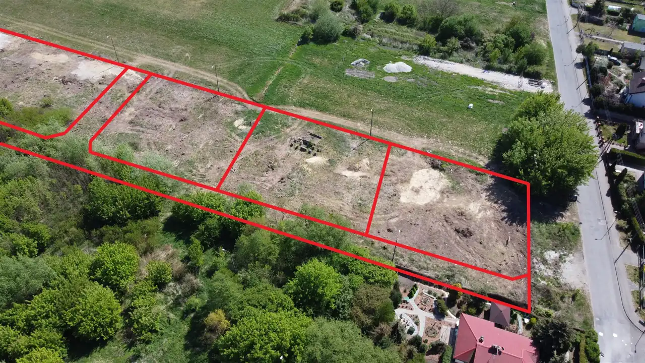 Woda, kanalizacja, prąd i gaz w pasie drogowym obok działki (w ul. Widok).W sąsiedztwie inne działki z tego samego podziału. Pierwsze trzy działki od ulicy Widok w cenie 250 zł/m2, kolejne działki w cenie 210 zł/m2.