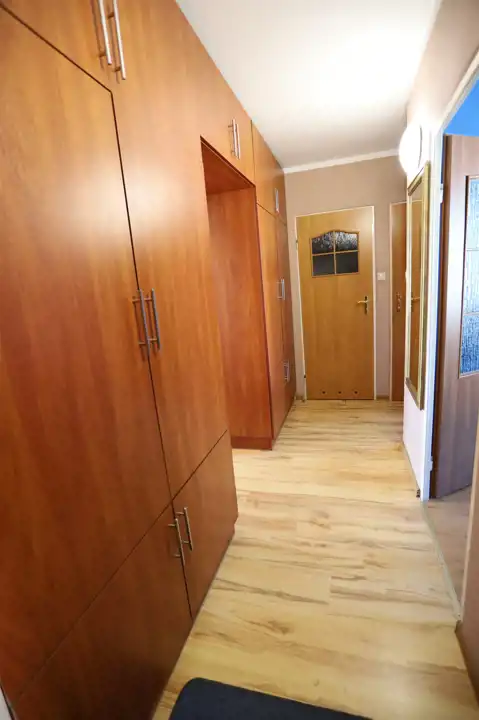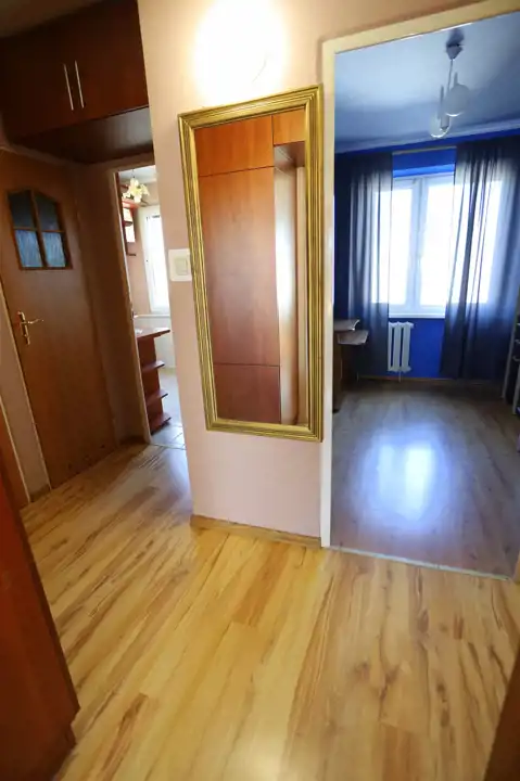 Mieszkanie wymaga odświeżenia. Na podłodze panele, na ścianach gładzie. W przedpokoju duża szafa w zabudowie.