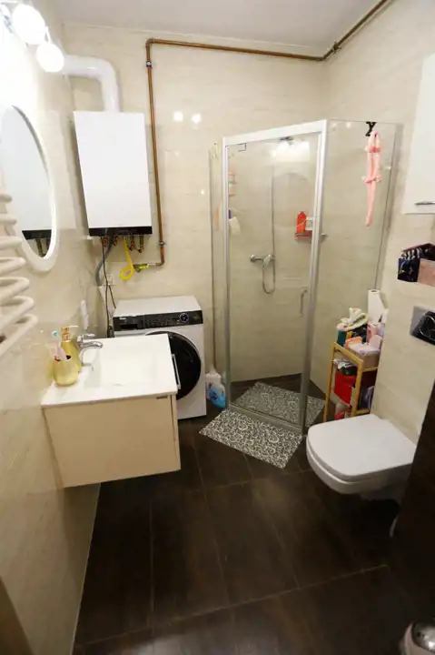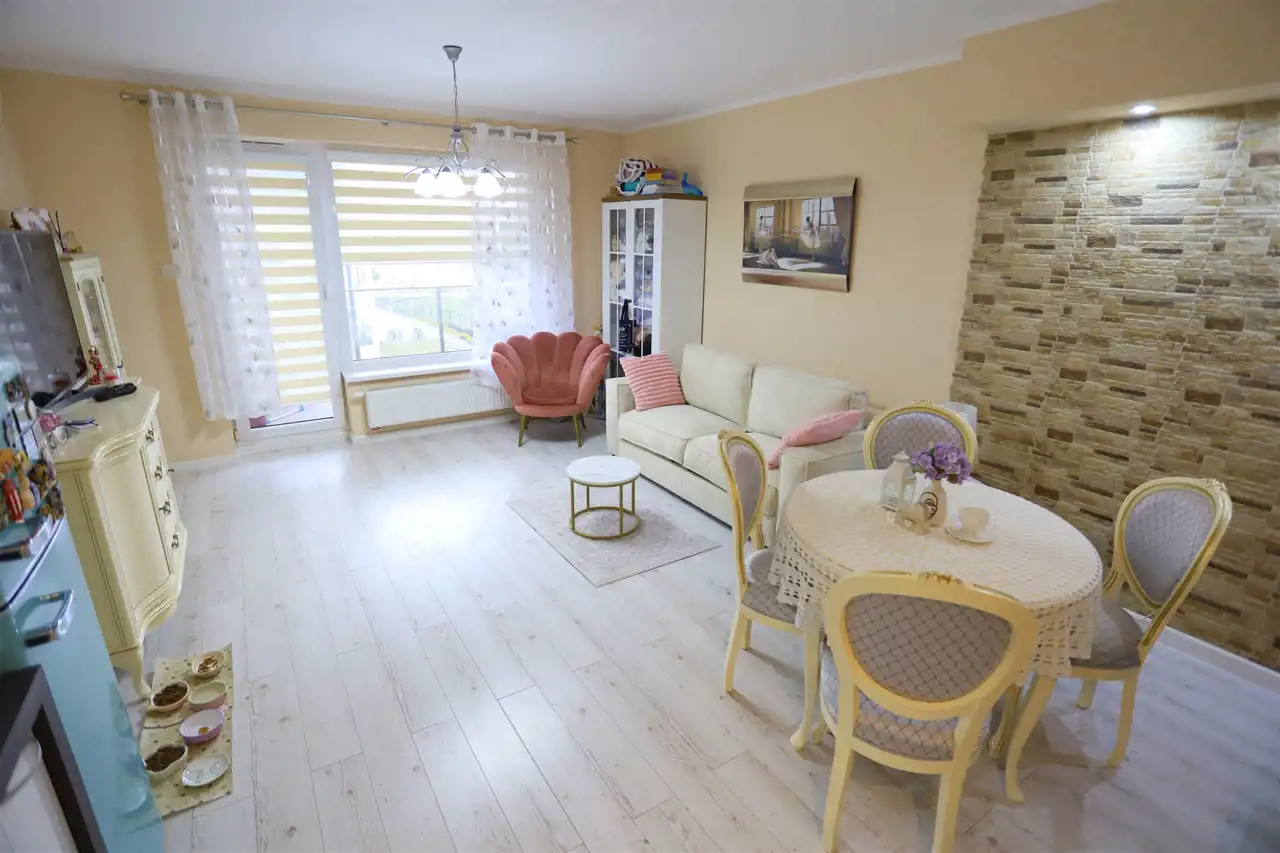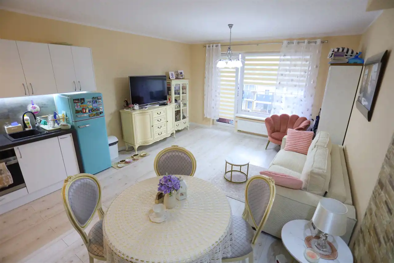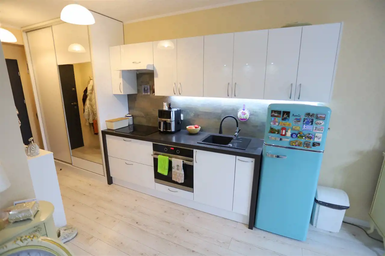 W pokojach na podłodze panele podłogowe, na ścianach gładzie, łazienka nowocześnie wykończona i wyposażona. Aneks kuchenny z nowoczesną zabudowa kuchenną z płytą indukcyjną, piekarnikiem, zmywarką i lodówką. W przedpokoju szafa w zabudowie.