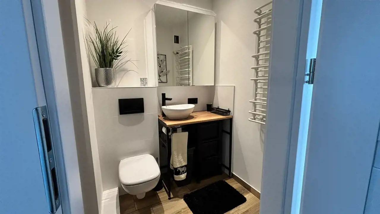 Na podłogach pokoi oraz przedpokoju panele, w łazience płytki.