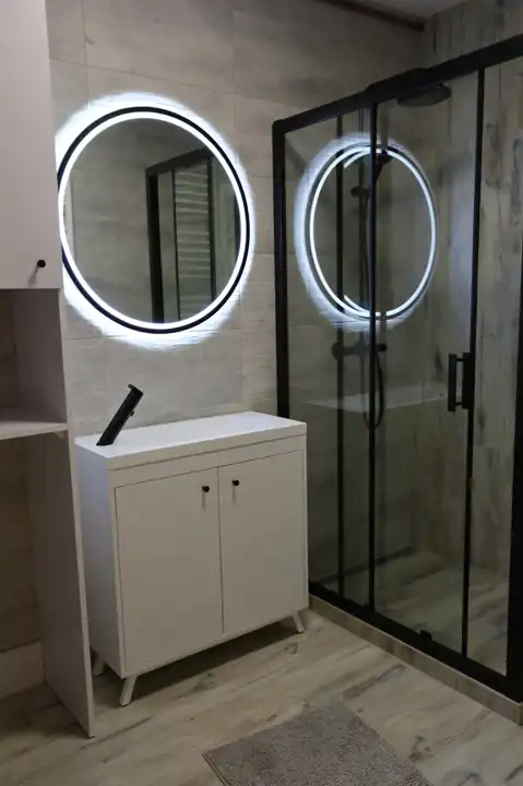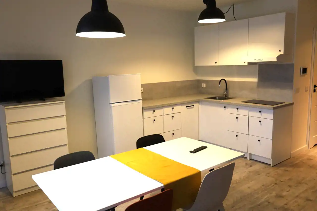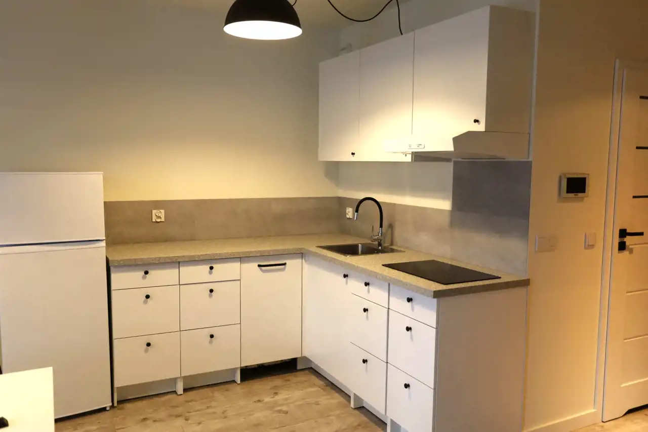 W cenie mieszkania znajduje się wykończenie i wyposażenie w meble i sprzęt AGD i RTV widoczne na zdjęciach - w kuchni zabudowa kuchenna z płytą indukcyjną, lodówką, zmywarką, w łazience nowoczesna glazura, kabina prysznicowa.