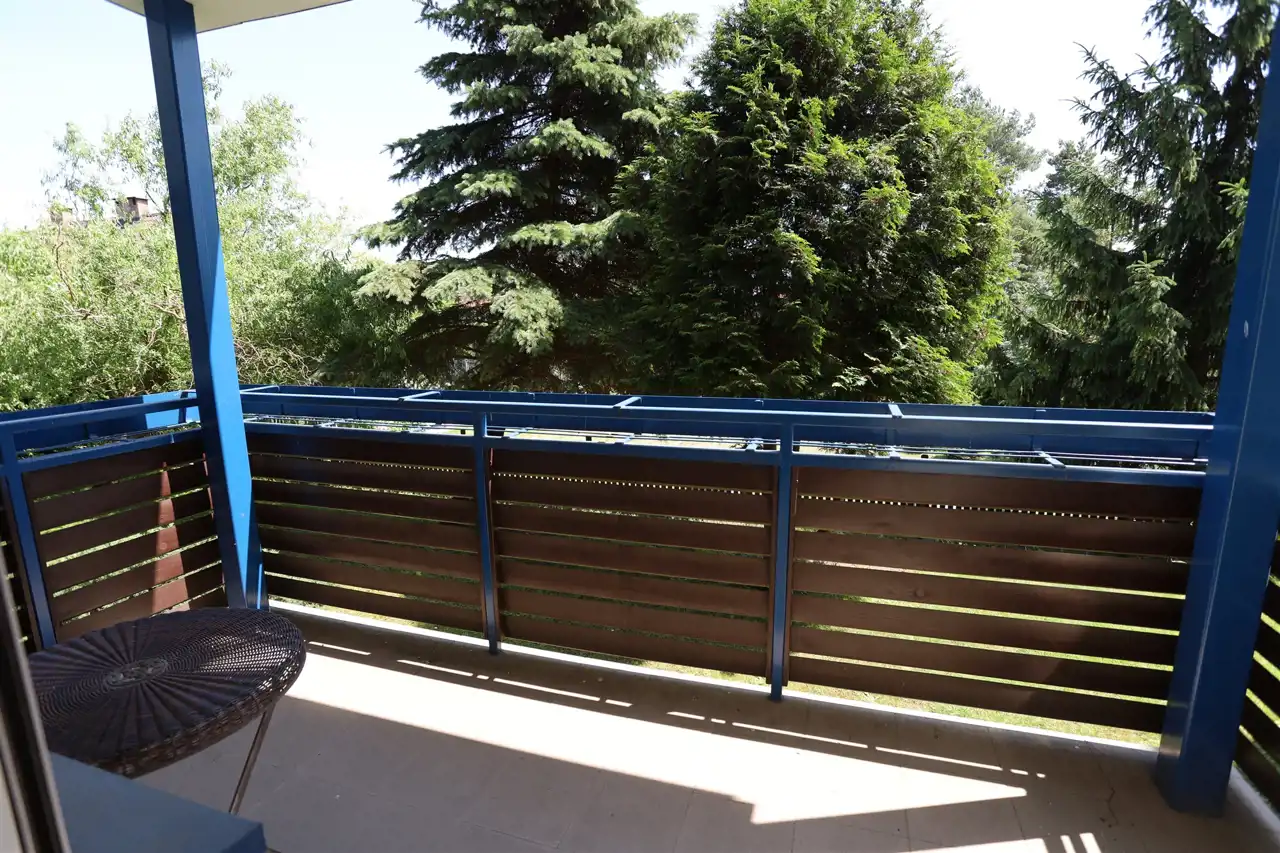 Z salonu wyjście na duży balkon z widokiem na teren zagospodarowany zielenią.