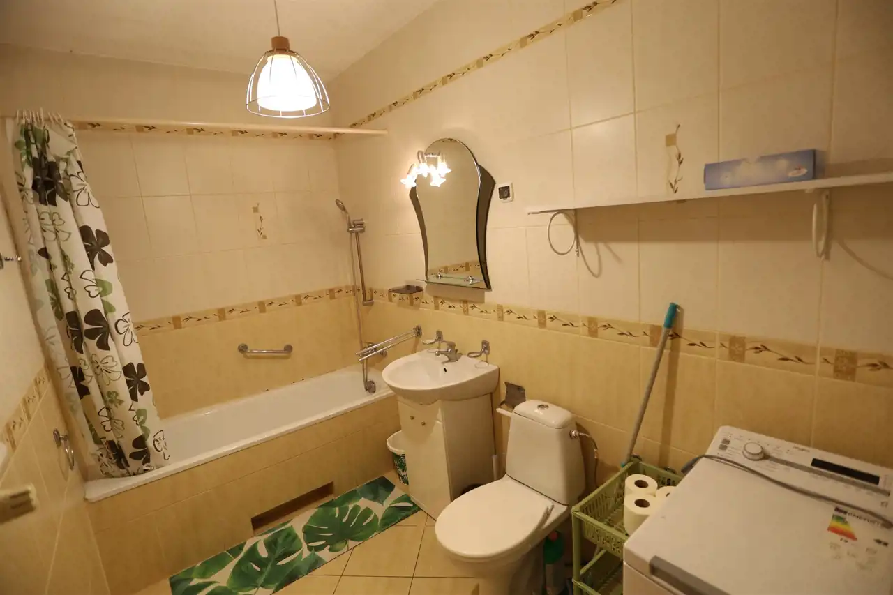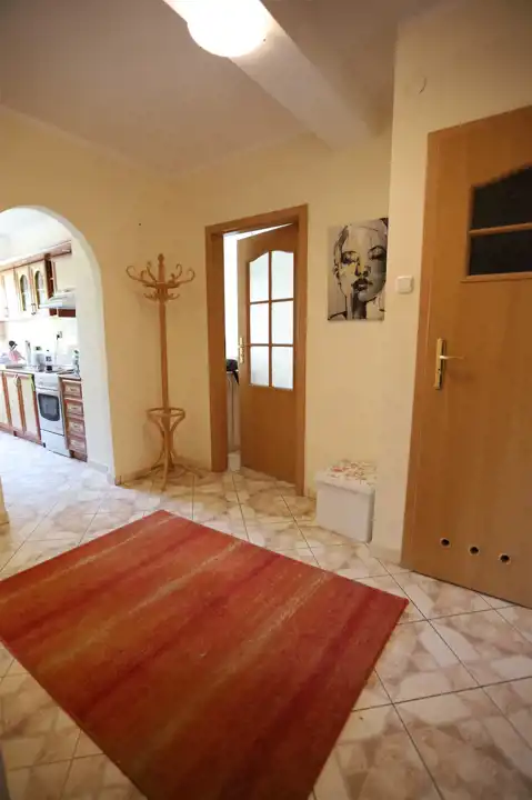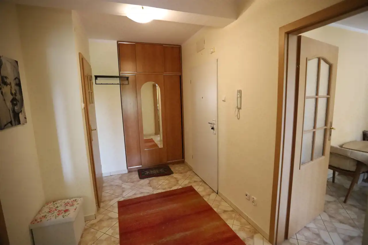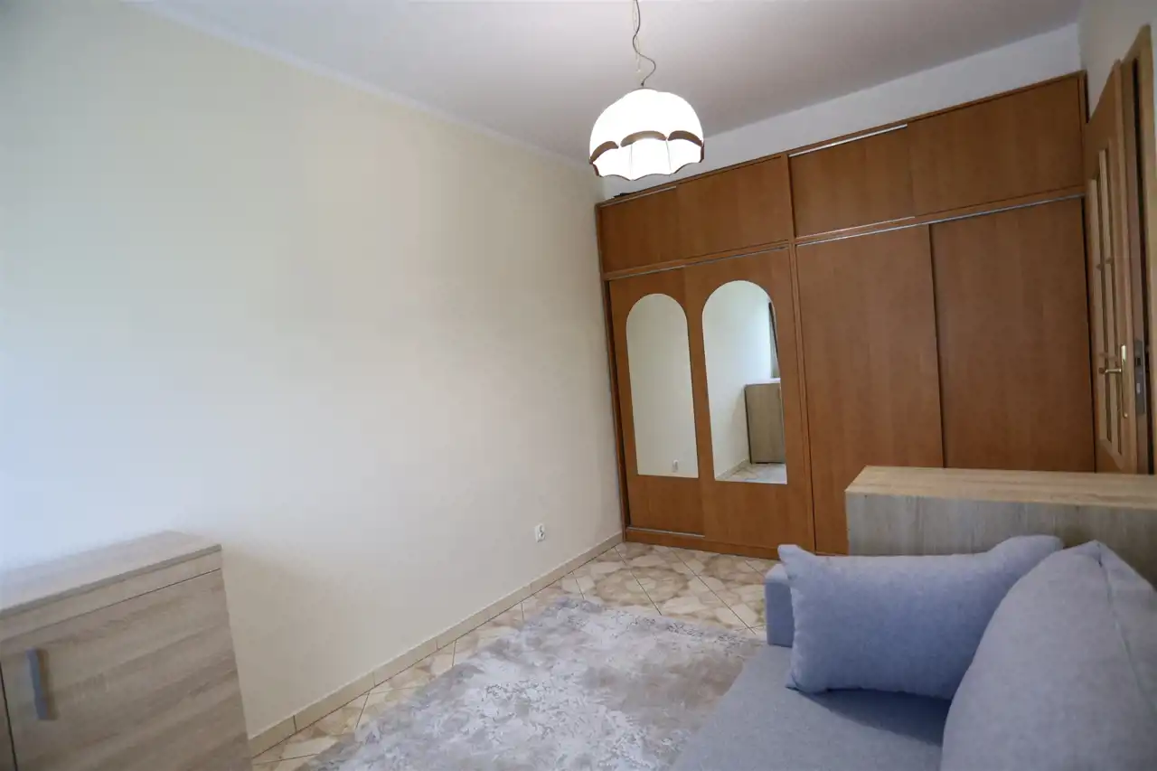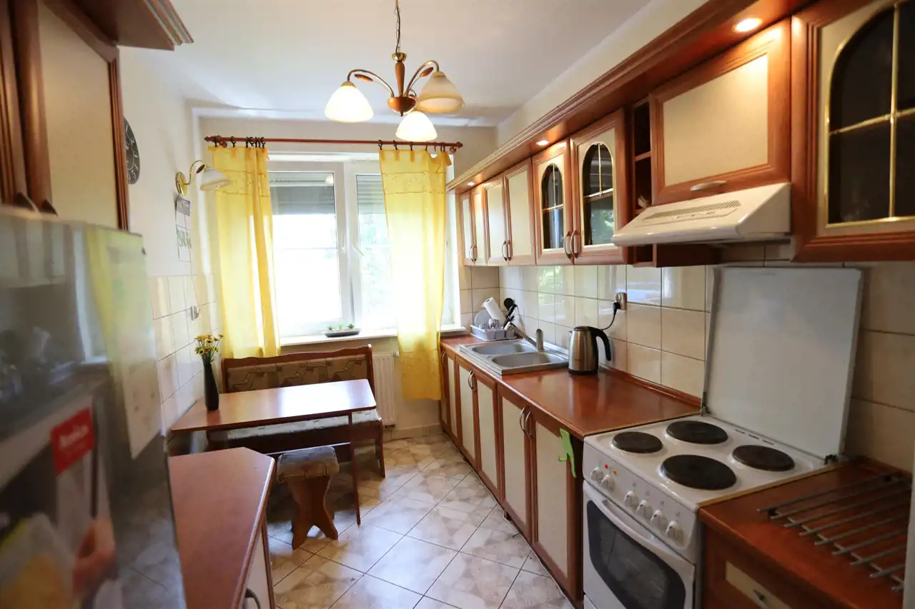 Lokal mieszkalny składa się z dwóch pokoi (23m2/12m2), oddzielnej kuchni (8m2) oraz dużej łazienki z wc i wanną (7m2) i przedpokoju (7m2) i przynależnej komórki lokatorskiej (6,10m2). Podłogi wyłożone płytkami, na ścianach gładzie, w łazience glazura nowego typu.