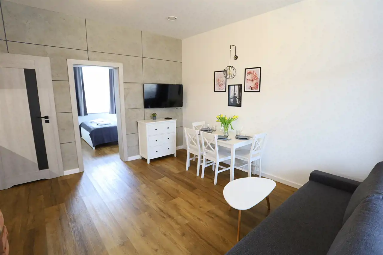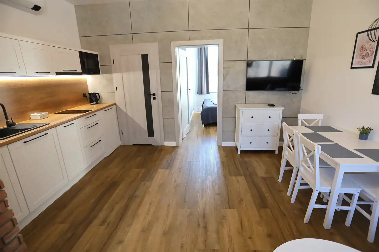 Mieszkanie posiada przestronny salon z aneksem kuchennym (w pełni wyposażonym), sypialnię oraz łazienkę z natryskiem. W sypialni są dwa pojedyncze łóżka oraz obszerna szafa. W salonie mamy sofę z funkcją spania.