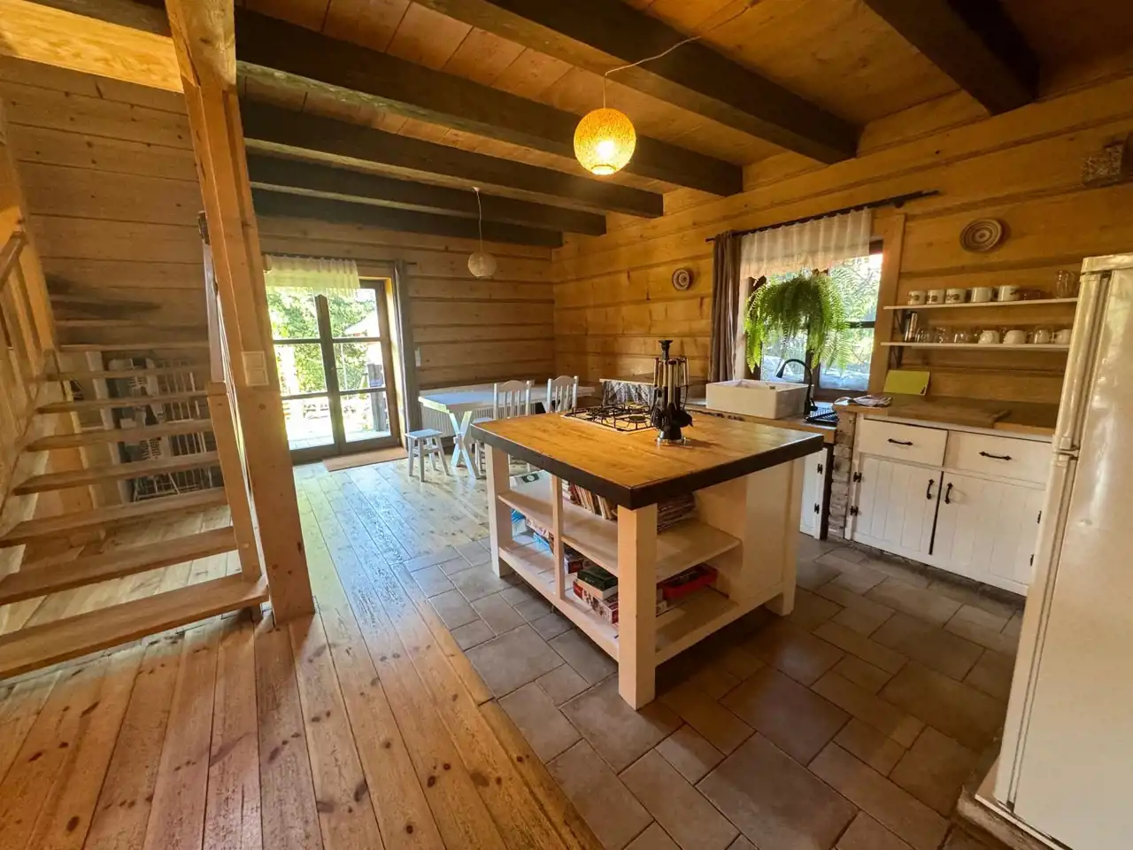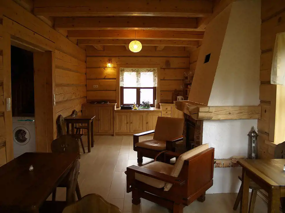 - z częścią wspólną dla gości, w której znajduje się aneks kuchenny z jadalnią i salonem kominkiem z wyjściem na taras.