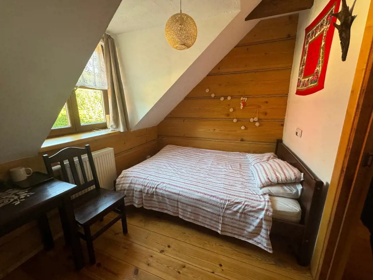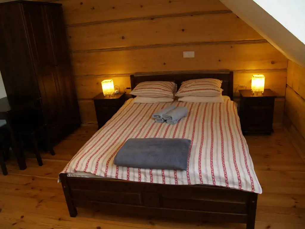 Na poddaszu znajdują się: 2 pokoje z łazienką z wanną. Pokoje 2 i 3 osobowe- bardzo przestronne z balkonami. Przedpokój w którym znajdują się szafy wykonane na wymiar przez stolarza, bardzo pojemne zamykane.