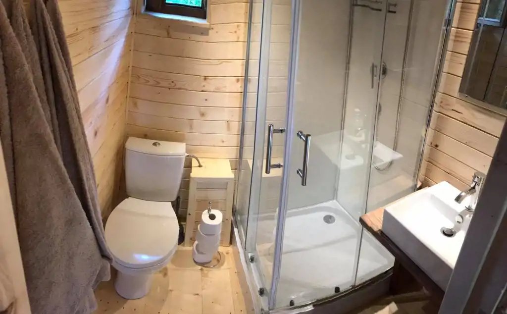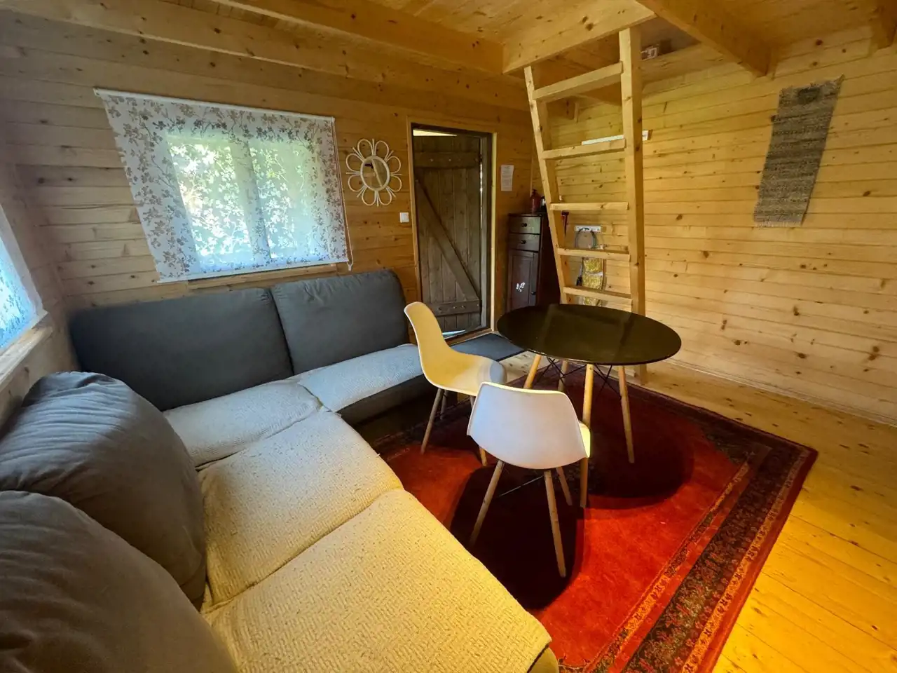 Domek drewniany szkieletowy, o podstawie zabudowy 7x4 m , ocieplony wełna mineralną, posiada: salon z aneksem kuchennym i łazienką na parterze oraz 2 pokoje na poddaszu, budynku wyjście na taras.