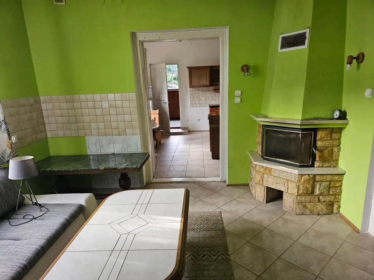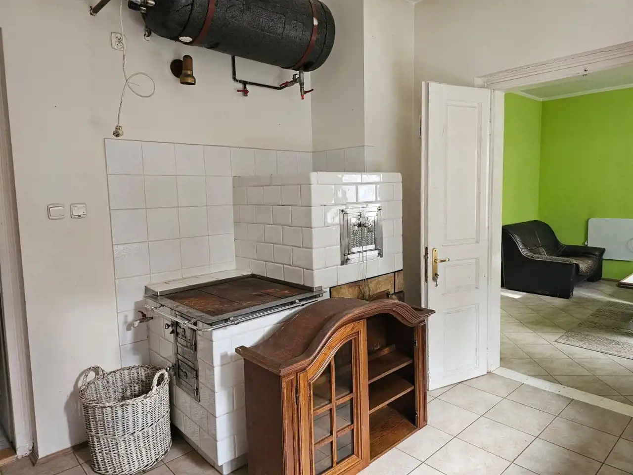 Budynek ogrzewany jest za pomocą kominka na drewno, kuchni kaflowej na drewno