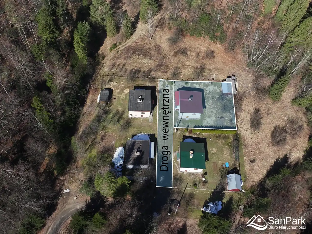 Dojazd do nieruchomości zapewnia utwardzona droga gminna, a następnie droga wewnętrzna, w której kupujący nabywa udział.