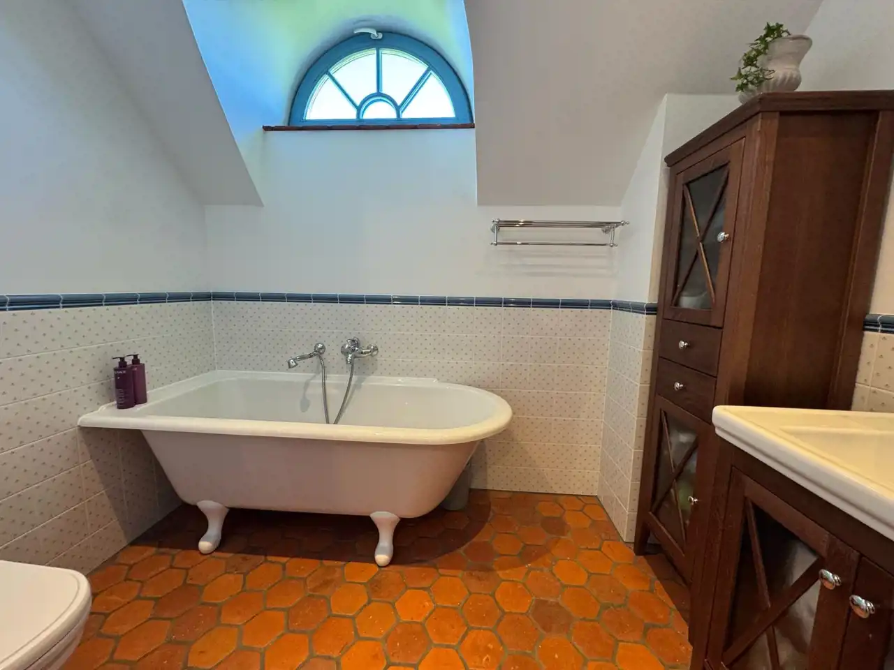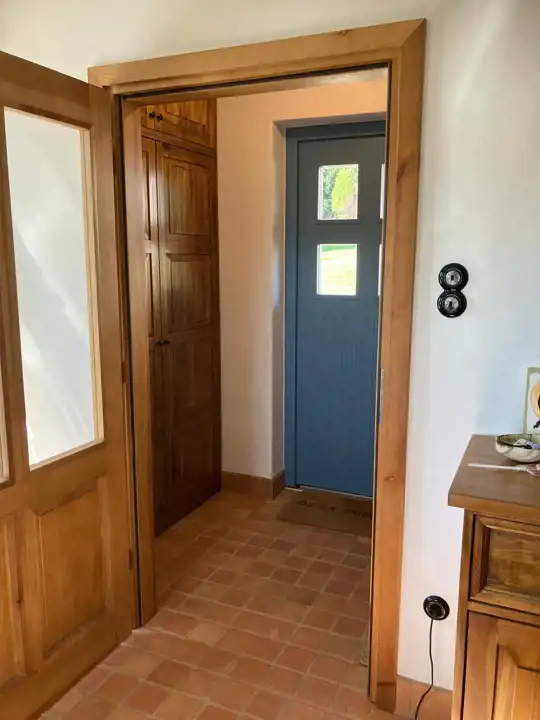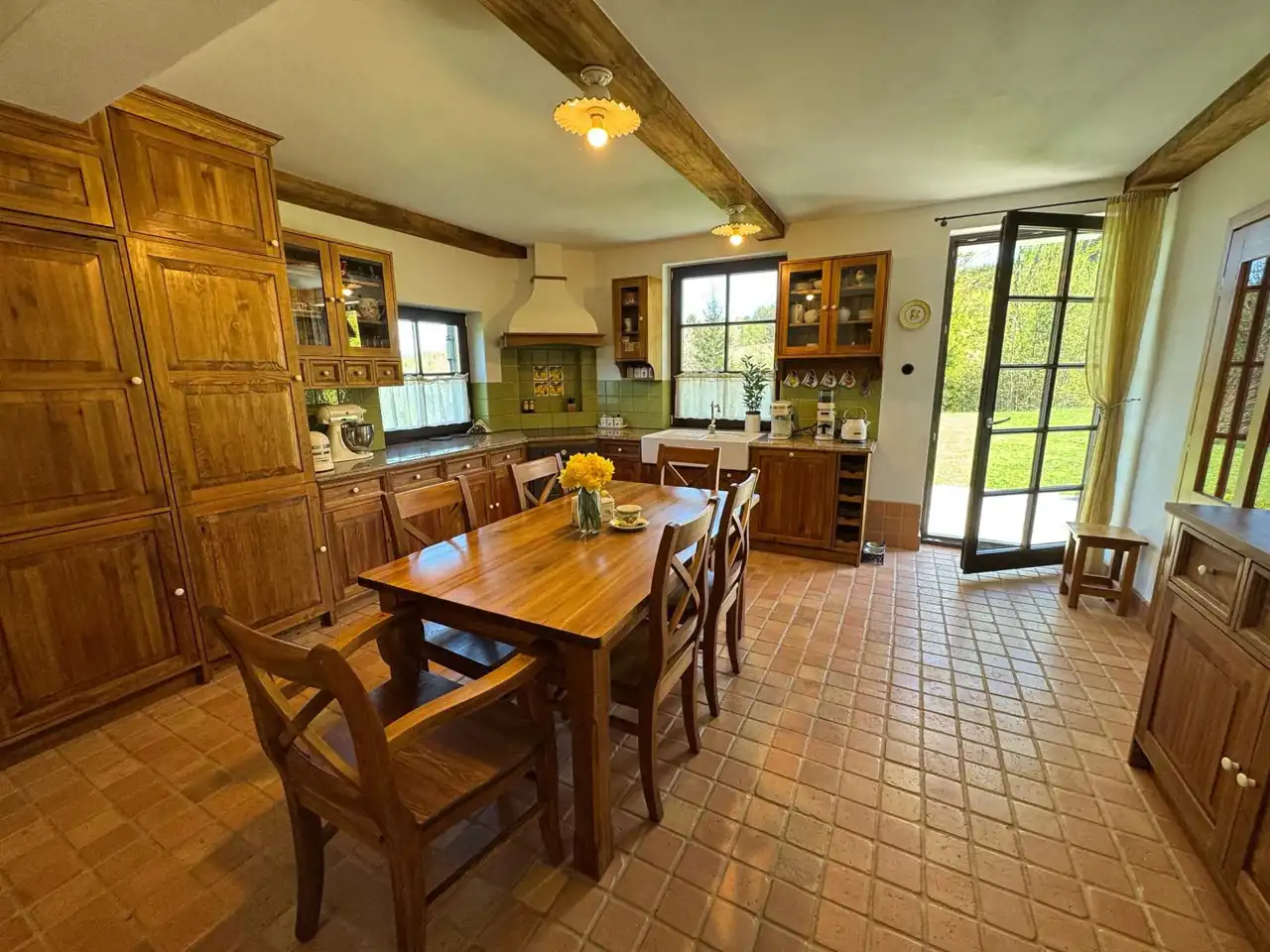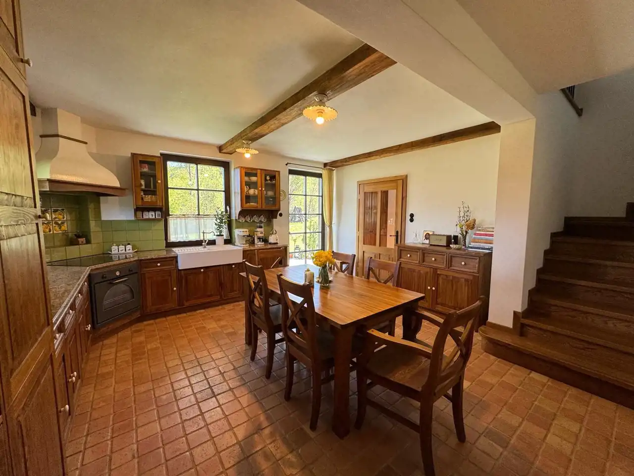 Budynek ogrzewany pompą ciepła i na całości posiada ogrzewanie podłogowe, w garażu grzejnik. Podłoga na parterze wykonana z cegły, na poddaszu drewniana. W łazience terakota. Meble, drzwi i parapety drewniane, blat marmur. Dom w pełni wyposażony; pralka, lodówka, zmywarka - w zabudowie, piekarnik, płyta indukcyjna elektryczna czteropalnikowa.