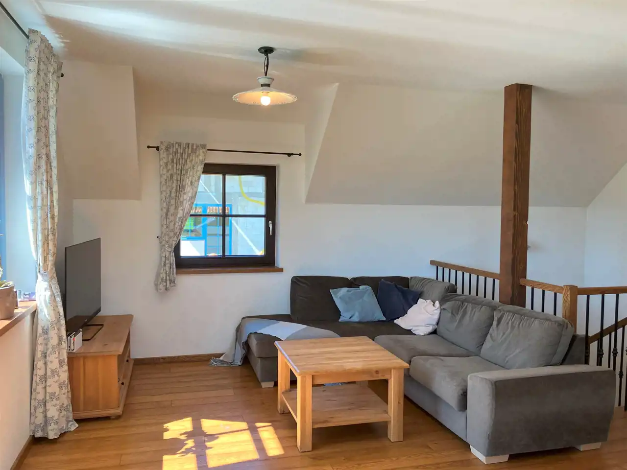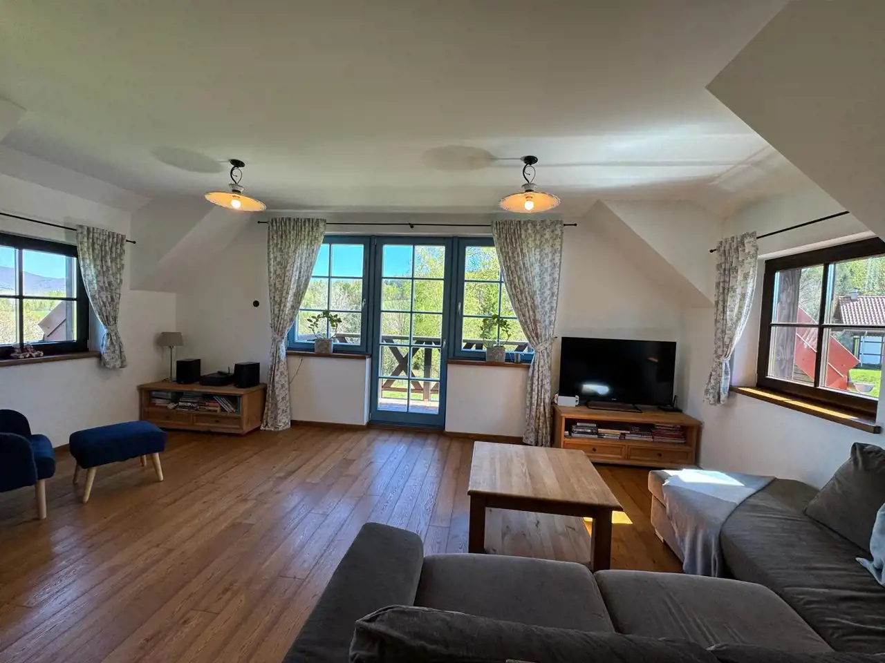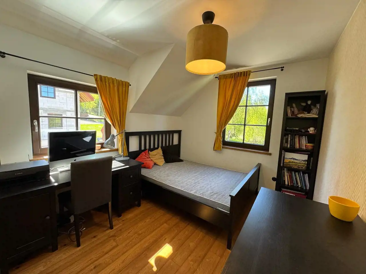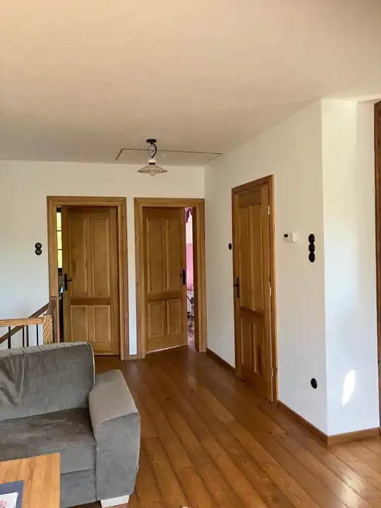 Parter budynku stanowi kuchnia z jadalnią z wyjściem na taras i ogród, wc z prysznicem, przedsionek, pom. gospodarcze oraz garaż. Na poddaszu dwie sypialnie, łazienka z wanną oraz salon z balkonem z widokiem na góry.