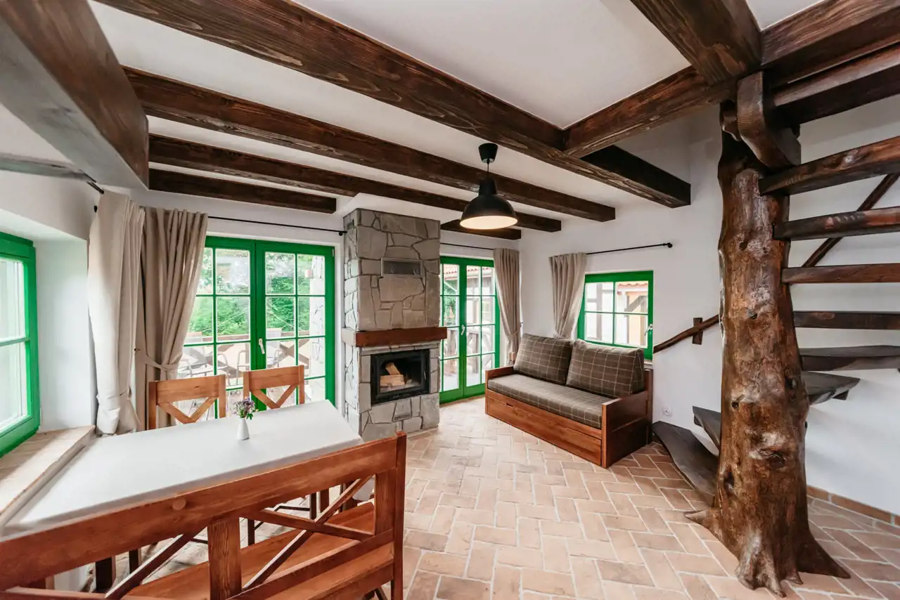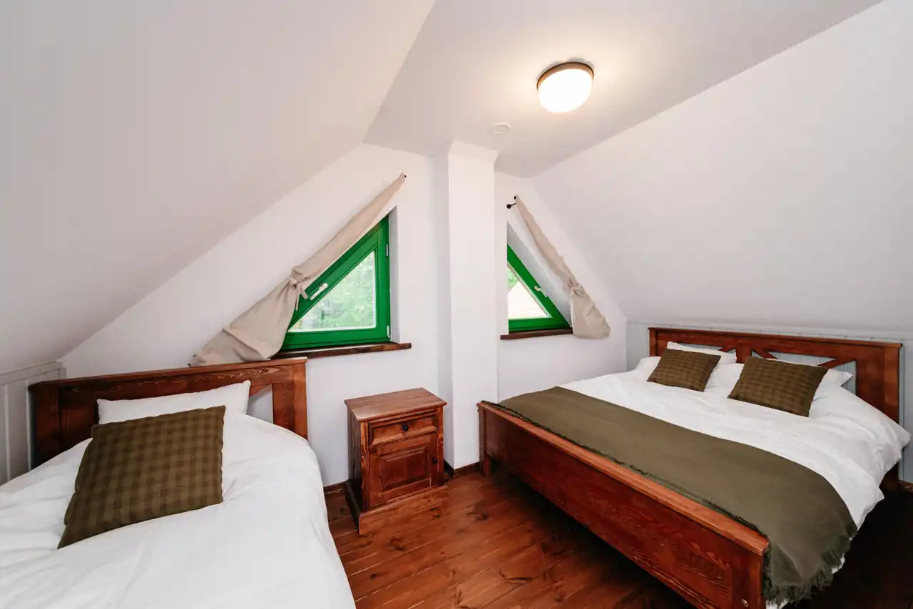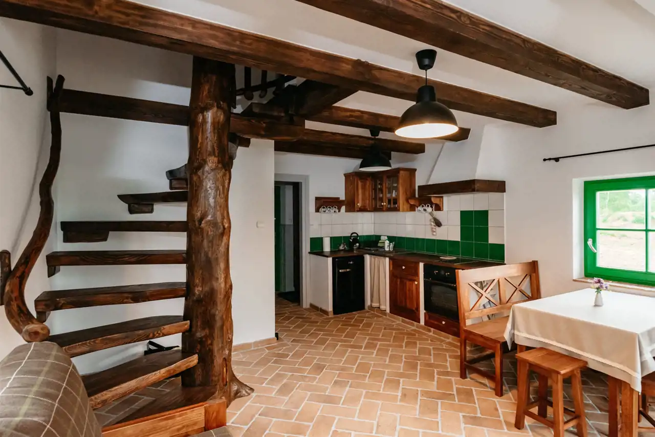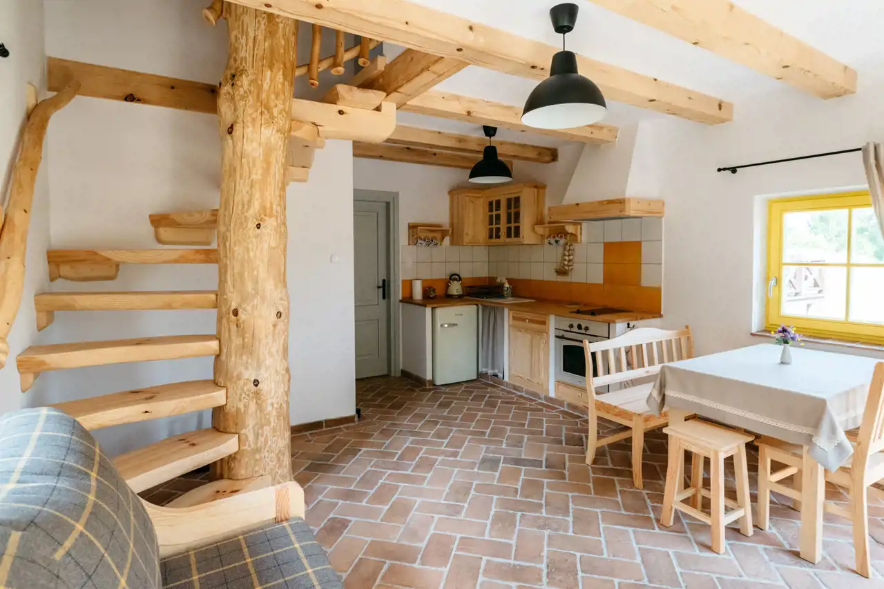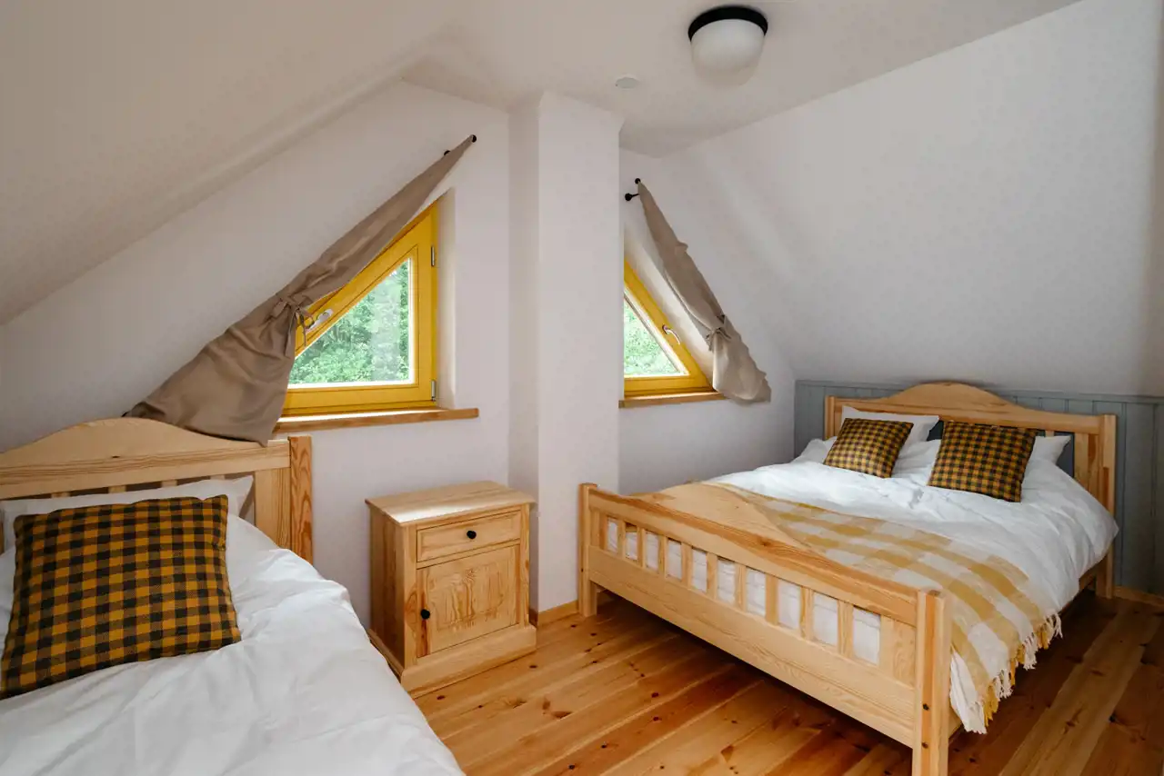 Podłoga na parterze wykonana z cegły, na poddaszu drewniana. Meble i drzwi drewniane. Domki w pełni wyposażone; lodówka, piekarnik, płyta elektryczna dwupalnikowa, pościel, naczynia.