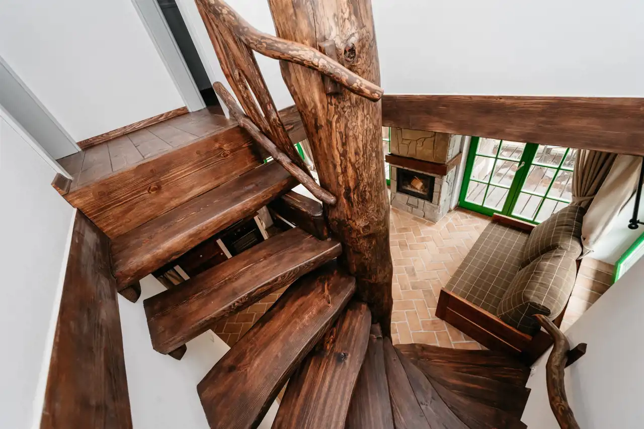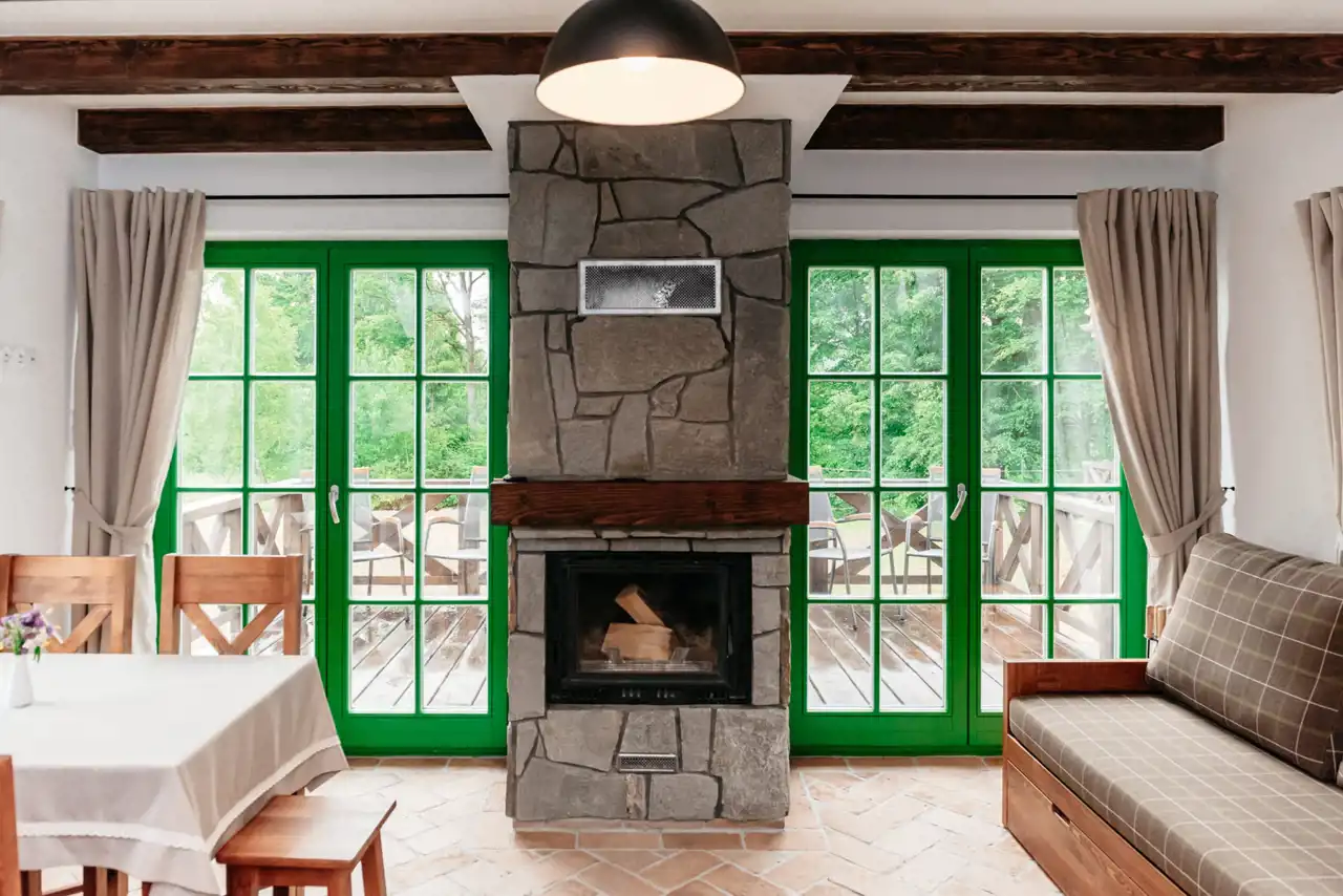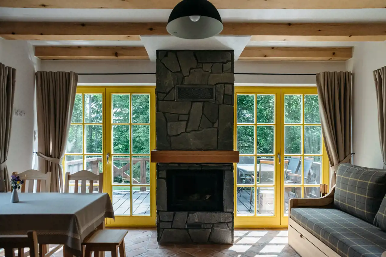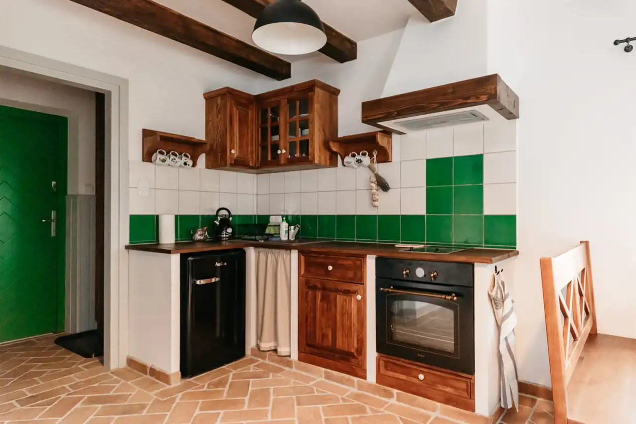 Podłoga na parterze wykonana z cegły, na poddaszu drewniana. Meble i drzwi drewniane. Domki w pełni wyposażone; lodówka, piekarnik, płyta elektryczna dwupalnikowa, pościel, naczynia.