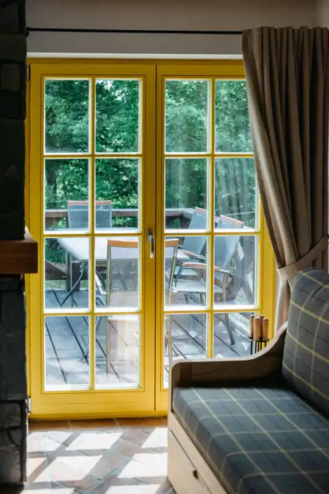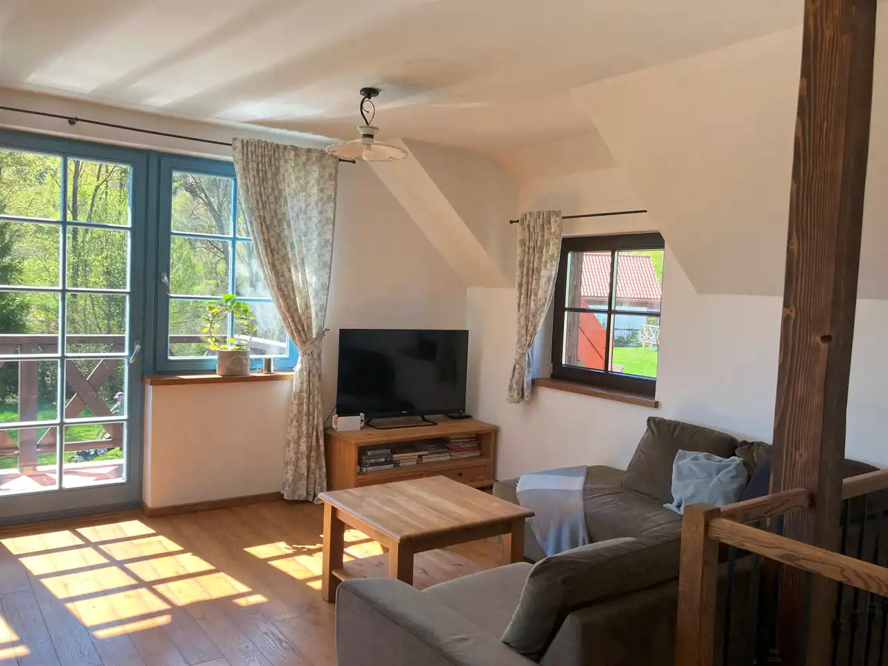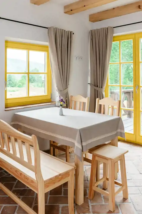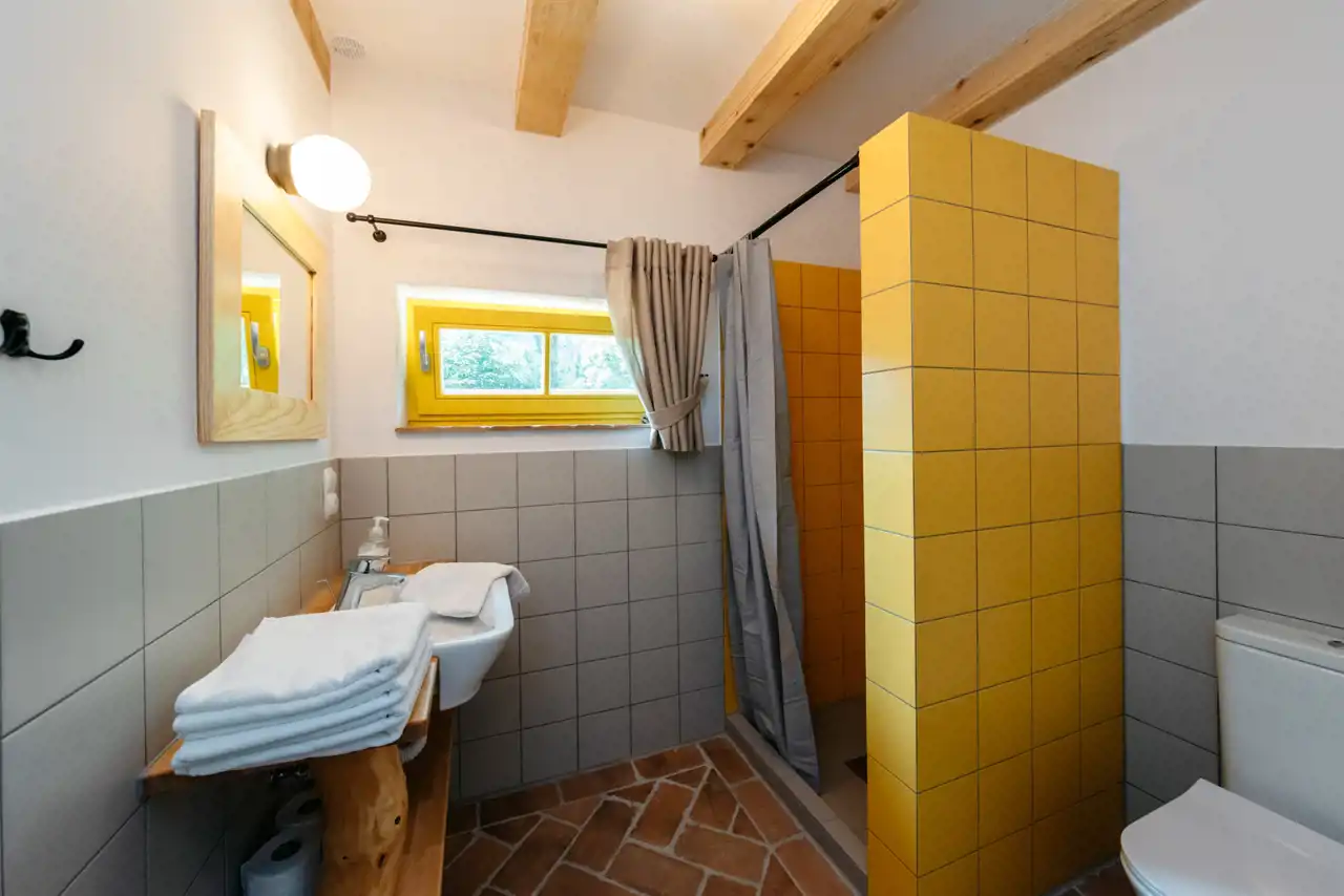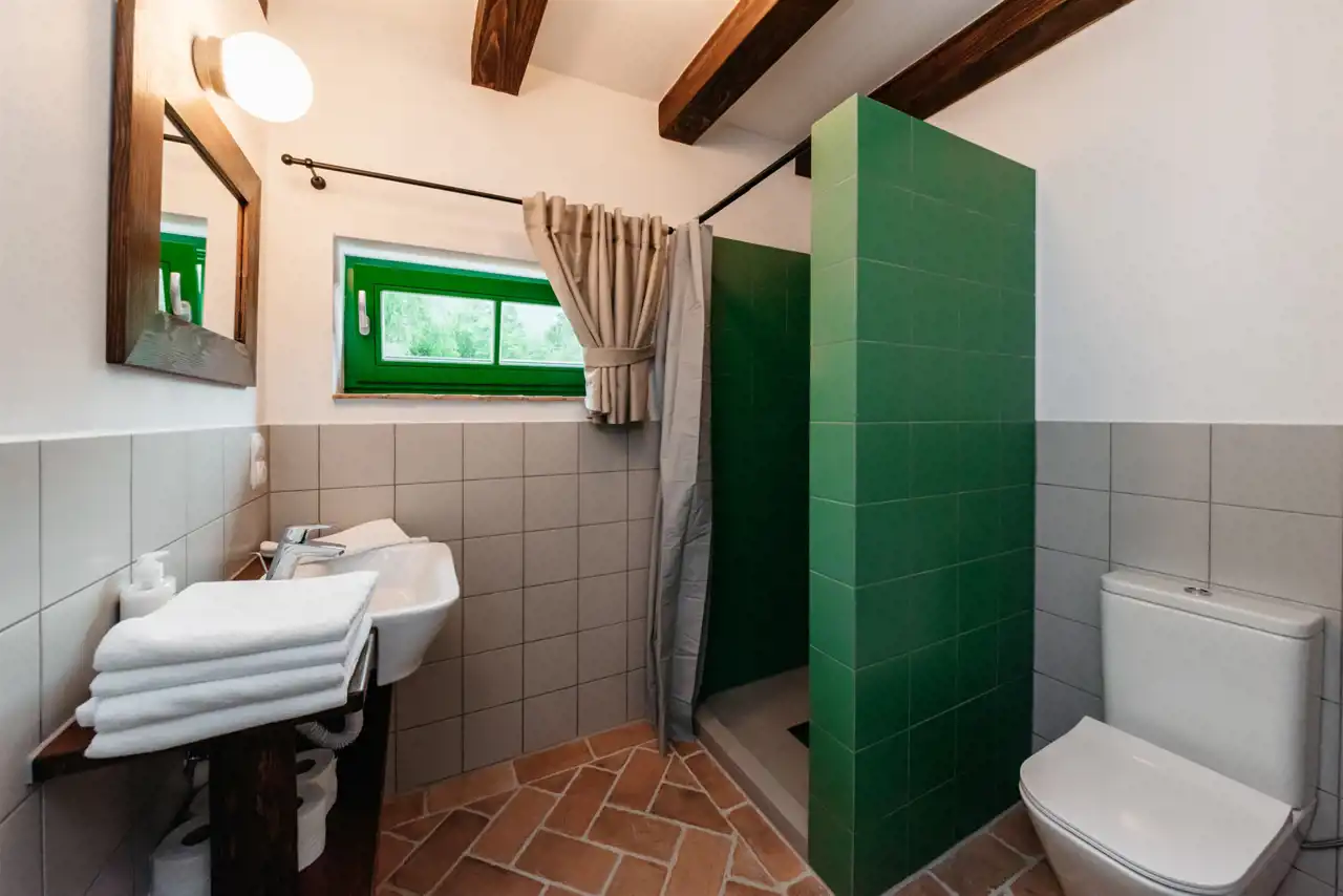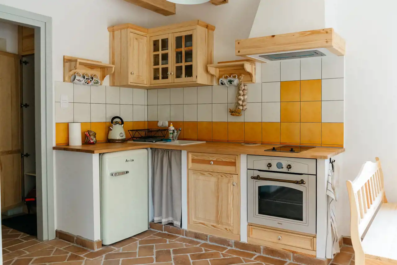 Podłoga na parterze wykonana z cegły, na poddaszu drewniana. Meble i drzwi drewniane. Domki w pełni wyposażone; lodówka, piekarnik, płyta elektryczna dwupalnikowa, pościel, naczynia.