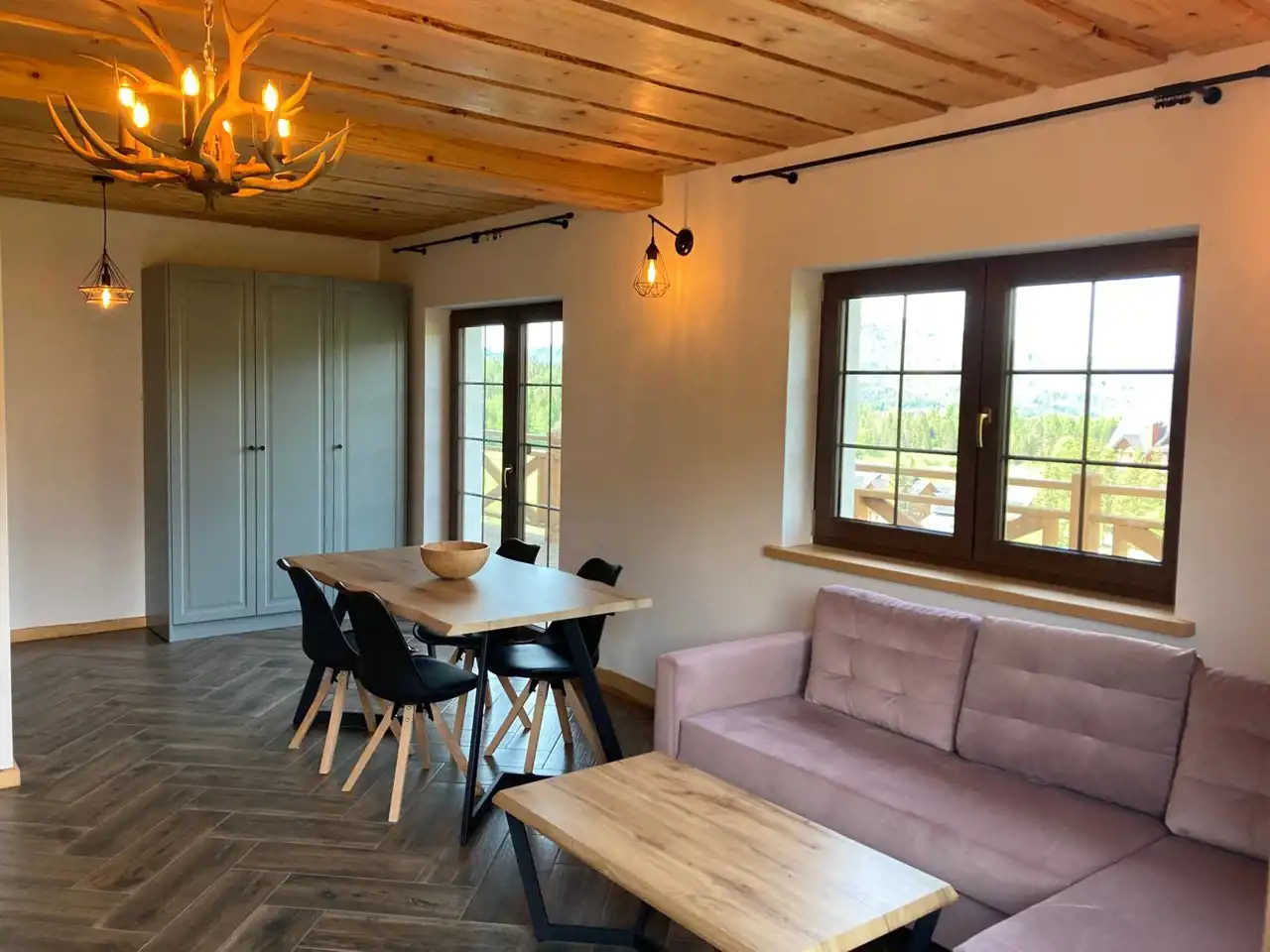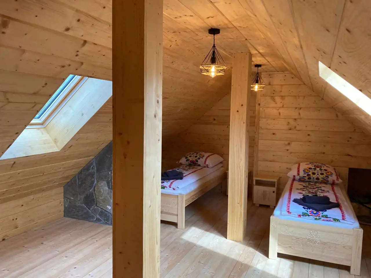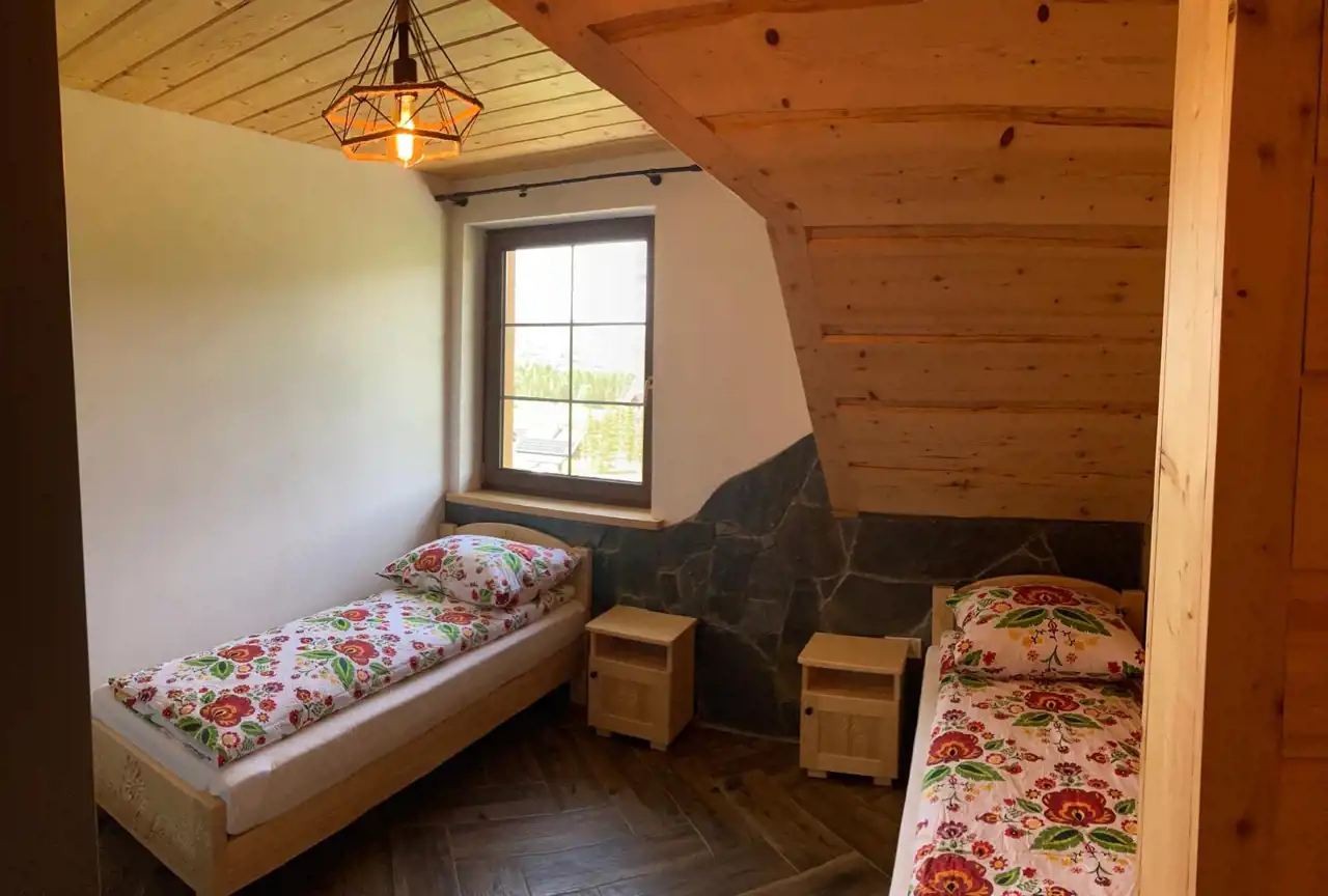 Przemyślamy układ pomieszczeń tworzy wyjątkowe apartamenty, które są w pełni wyposażone. Każdy z apartamentów posiada kuchnię wraz z sprzętem AGD, salon z wyjściem na taras, łazienkę, sypialnie z łóżkami i materacami, które można ze sobą łączyć w zależności od potrzeb gości. W pomieszczeniach możliwe jest wykonanie kominków wolnostojących. Sufity na poddaszu wykończone drewnem jodłowo-świerkowym. Schody i parapety jesionowe. Drzwi wewnętrzne sosnowe. Okna w całym budynku plastikowe, trzy szybowe montowane w systemie ciepłego montażu, podłogi wykończone płytkami w kolorystyce drewna. Tarasy wykonane zostały z drewna modrzewiowego i świerkowego. Elewacyjna budynku wykończona została deskami z drewna świerkowego .