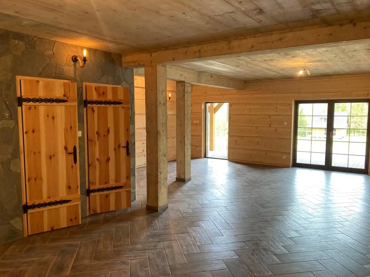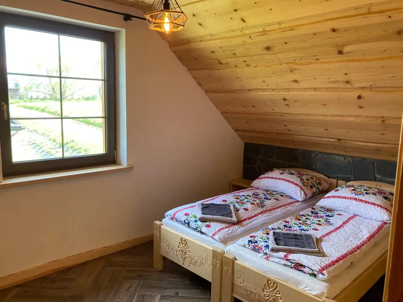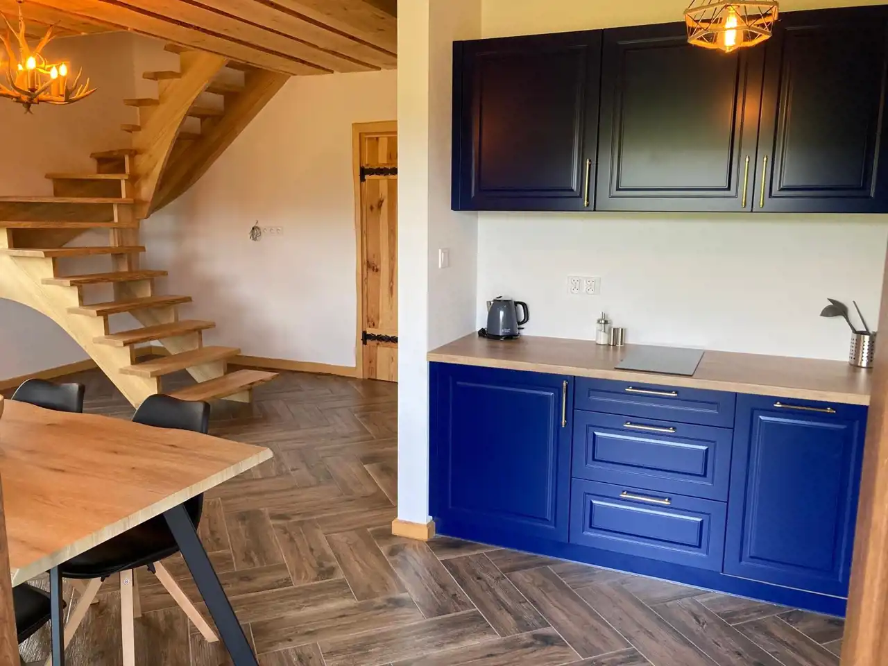 Przemyślamy układ pomieszczeń tworzy wyjątkowe apartamenty, które są w pełni wyposażone. Każdy z apartamentów posiada kuchnię wraz z sprzętem AGD, salon z wyjściem na taras, łazienkę, sypialnie z łóżkami i materacami, które można ze sobą łączyć w zależności od potrzeb gości. W pomieszczeniach możliwe jest wykonanie kominków wolnostojących. Sufity na poddaszu wykończone drewnem jodłowo-świerkowym. Schody i parapety jesionowe. Drzwi wewnętrzne sosnowe. Okna w całym budynku plastikowe, trzy szybowe montowane w systemie ciepłego montażu, podłogi wykończone płytkami w kolorystyce drewna. Tarasy wykonane zostały z drewna modrzewiowego i świerkowego. Elewacyjna budynku wykończona została deskami z drewna świerkowego .