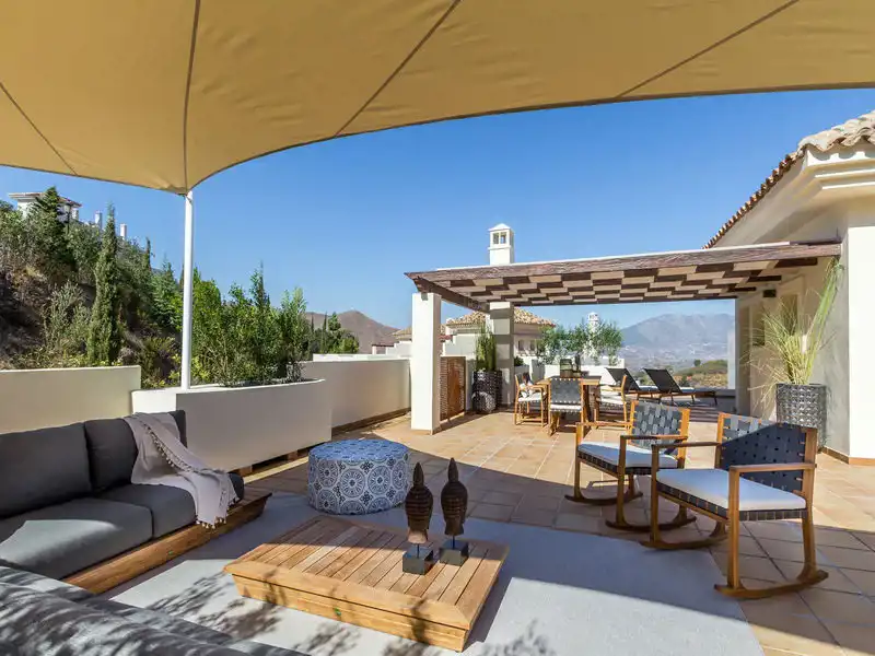 Przestronna część dzienna oraz duże tarasy wykonane w klasycznym hiszpańskim stylu architektonicznym