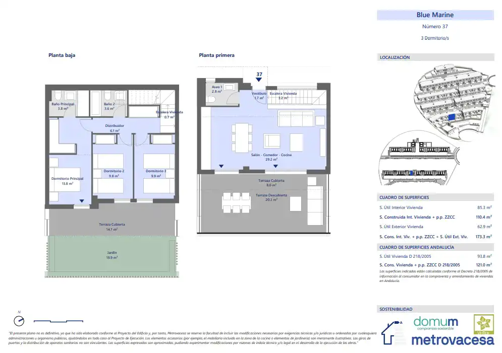 Jednym z głównych aspektów przy projektowaniu kompleksu mieszkalnego Blue Marine były kryteria zrównoważonego rozwoju i względy środowiskowe, dlatego wzięto je pod uwagę przy wyborze materiałów, izolacji i okien, które wykorzystują naturalne światło przyjazne dla środowiska dzięki niskiemu zużyciu. Domy o klasie energetycznej A.