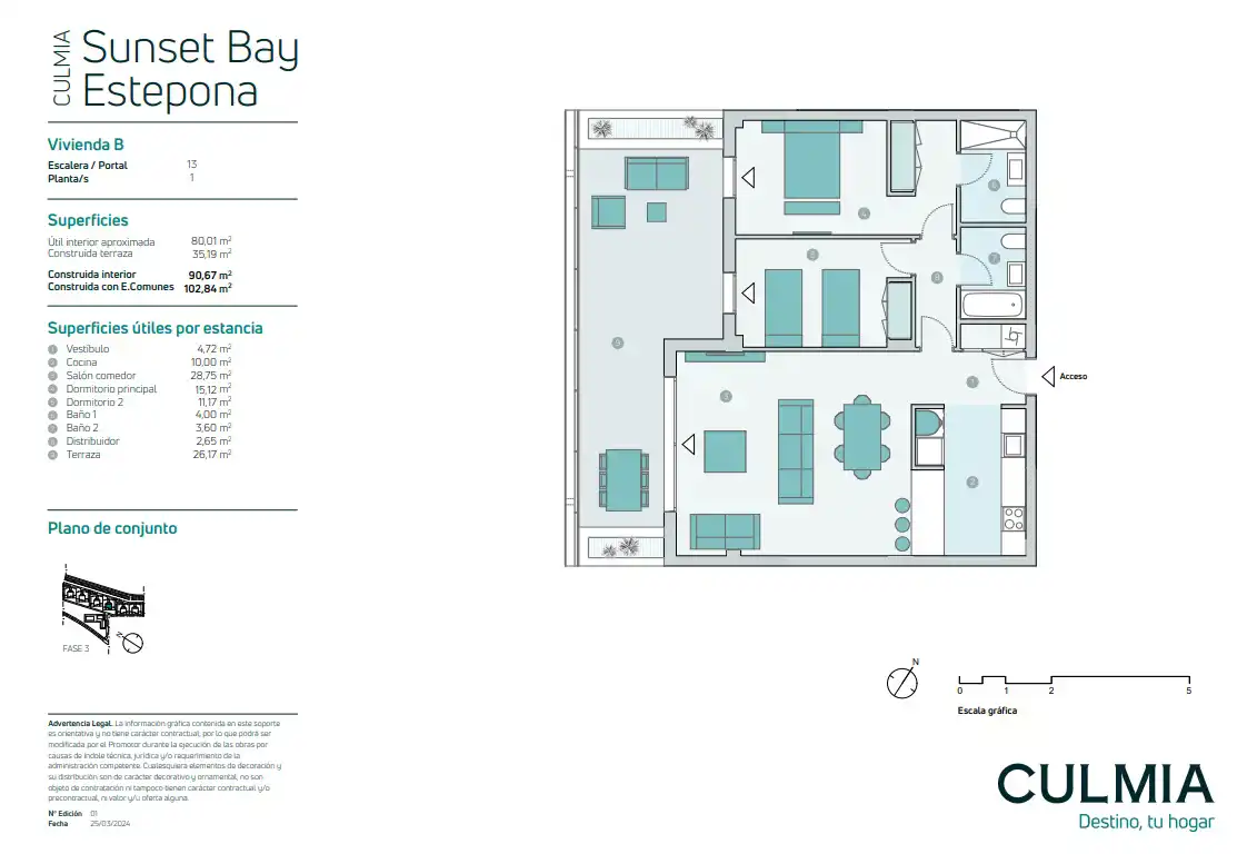 Culmia Sunset Bay Estepona składa się ze 174 apartamentów z dużymi tarasami i panoramicznym widokiem na morze od strony południowo-zachodniej. Domy posiadają naziemne miejsce parkingowe oraz komórkę lokatorską w trakcie rozwoju urbanizacji.