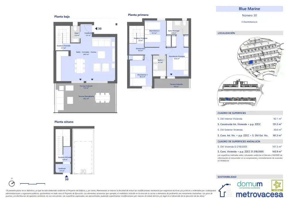 Jednym z głównych aspektów przy projektowaniu kompleksu mieszkalnego Blue Marine były kryteria zrównoważonego rozwoju i względy środowiskowe, dlatego wzięto je pod uwagę przy wyborze materiałów, izolacji i okien, które wykorzystują naturalne światło przyjazne dla środowiska dzięki niskiemu zużyciu. Domy o klasie energetycznej A.