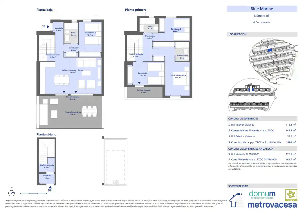 Jednym z głównych aspektów przy projektowaniu kompleksu mieszkalnego Blue Marine były kryteria zrównoważonego rozwoju i względy środowiskowe, dlatego wzięto je pod uwagę przy wyborze materiałów, izolacji i okien, które wykorzystują naturalne światło przyjazne dla środowiska dzięki niskiemu zużyciu. Domy o klasie energetycznej A.