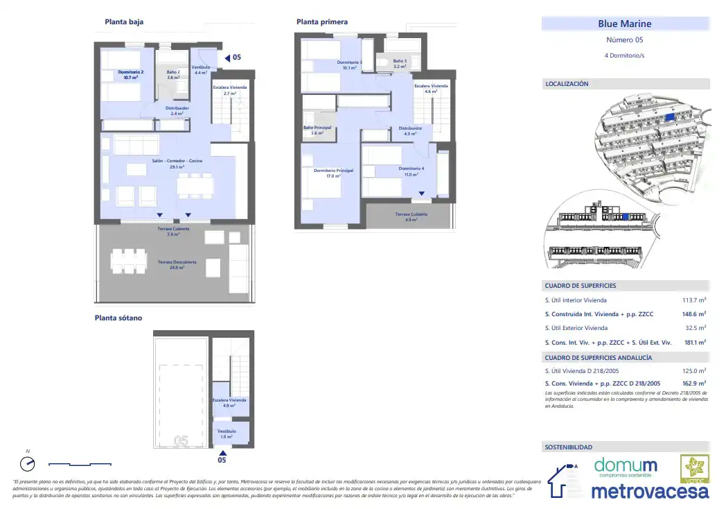 Jednym z głównych aspektów przy projektowaniu kompleksu mieszkalnego Blue Marine były kryteria zrównoważonego rozwoju i względy środowiskowe, dlatego wzięto je pod uwagę przy wyborze materiałów, izolacji i okien, które wykorzystują naturalne światło przyjazne dla środowiska dzięki niskiemu zużyciu. Domy o klasie energetycznej A.