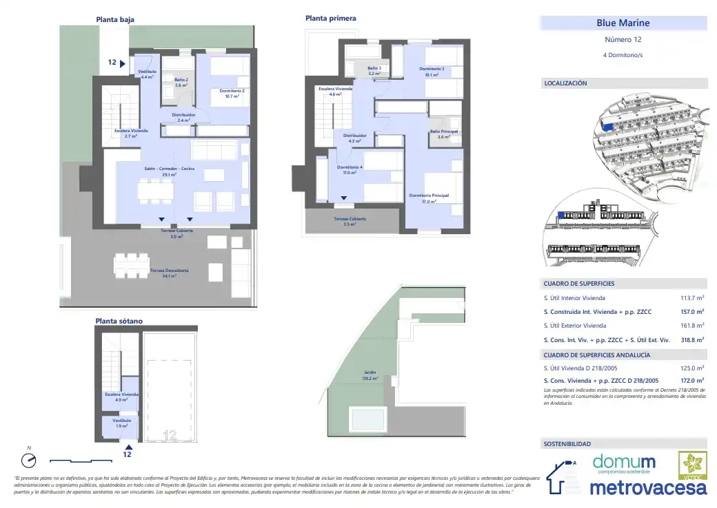 Jednym z głównych aspektów przy projektowaniu kompleksu mieszkalnego Blue Marine były kryteria zrównoważonego rozwoju i względy środowiskowe, dlatego wzięto je pod uwagę przy wyborze materiałów, izolacji i okien, które wykorzystują naturalne światło przyjazne dla środowiska dzięki niskiemu zużyciu. Domy o klasie energetycznej A.